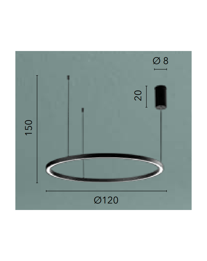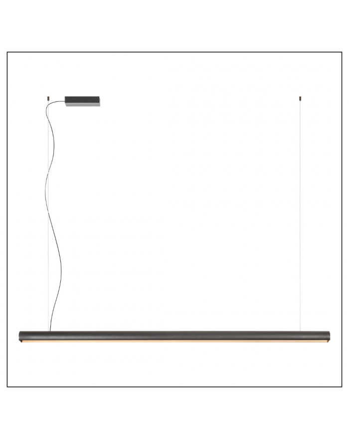 Sospensione con struttura dalla forma semi-circolare in metallo verniciato nero con rosone in metallo nero e cavi regolabili in acciaio. Sistema cambio colore temperatura con interruttore.