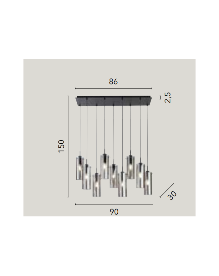 Sospensione 8 luci disponibile nelle varianti di colore nero opaco con diffusori in vetro soffiato fumè oppure in ottone satinato con diffusori in vetro soffiato color champagne.