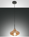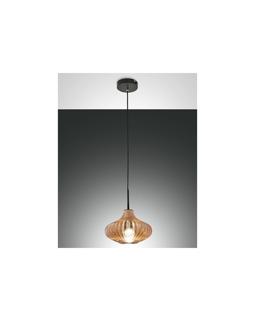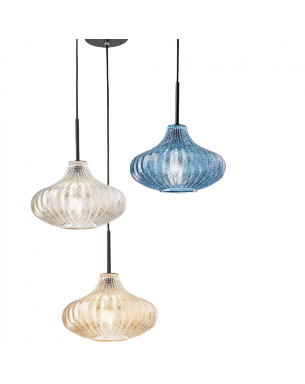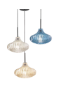 Sospensione 1 luce con struttura in metallo e diffusore in vetro soffiato. Disponibile ambra, azzurro e champagne.