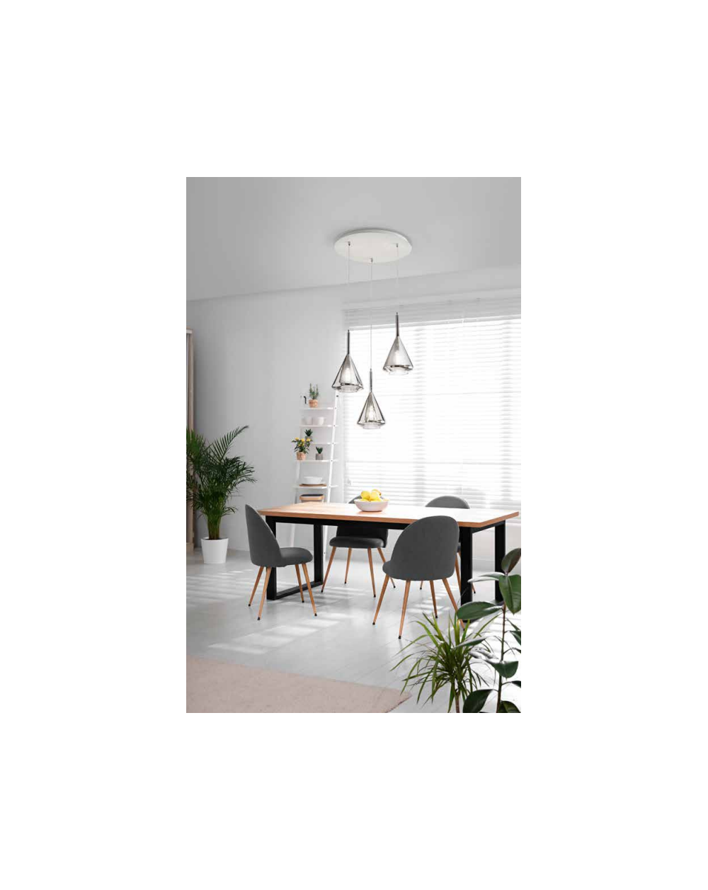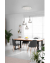 Sospensione a tre luci con struttura in metallo e vetri borosilicati: Disponibile in ambra, fumè o trasparente.