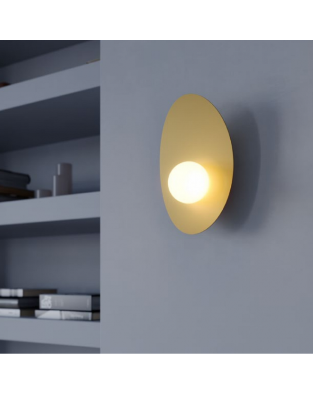 Applique 1 luce equipaggiata con LED COB. Struttura in metallo verniciato a polveri nero opaco con paralume in alluminio verniciato oro opaco o in metallo e alluminio verniciata a polveri nero opaco. Diffusore in vetro soffiato opale.