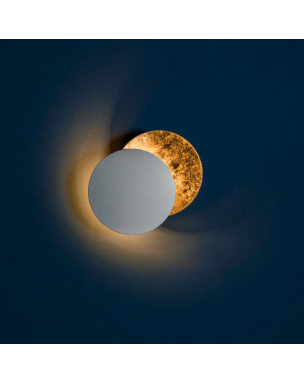 Lampada da parete con dischi in alluminio e base in metallo. Disponibile nei colori bianco, nero, foglia oro e foglia rame.