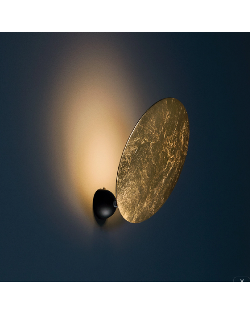 Lampada da parete con disco in alluminio e base in metallo. Disponibile nei colori bianco, nero, foglia oro e foglia rame.