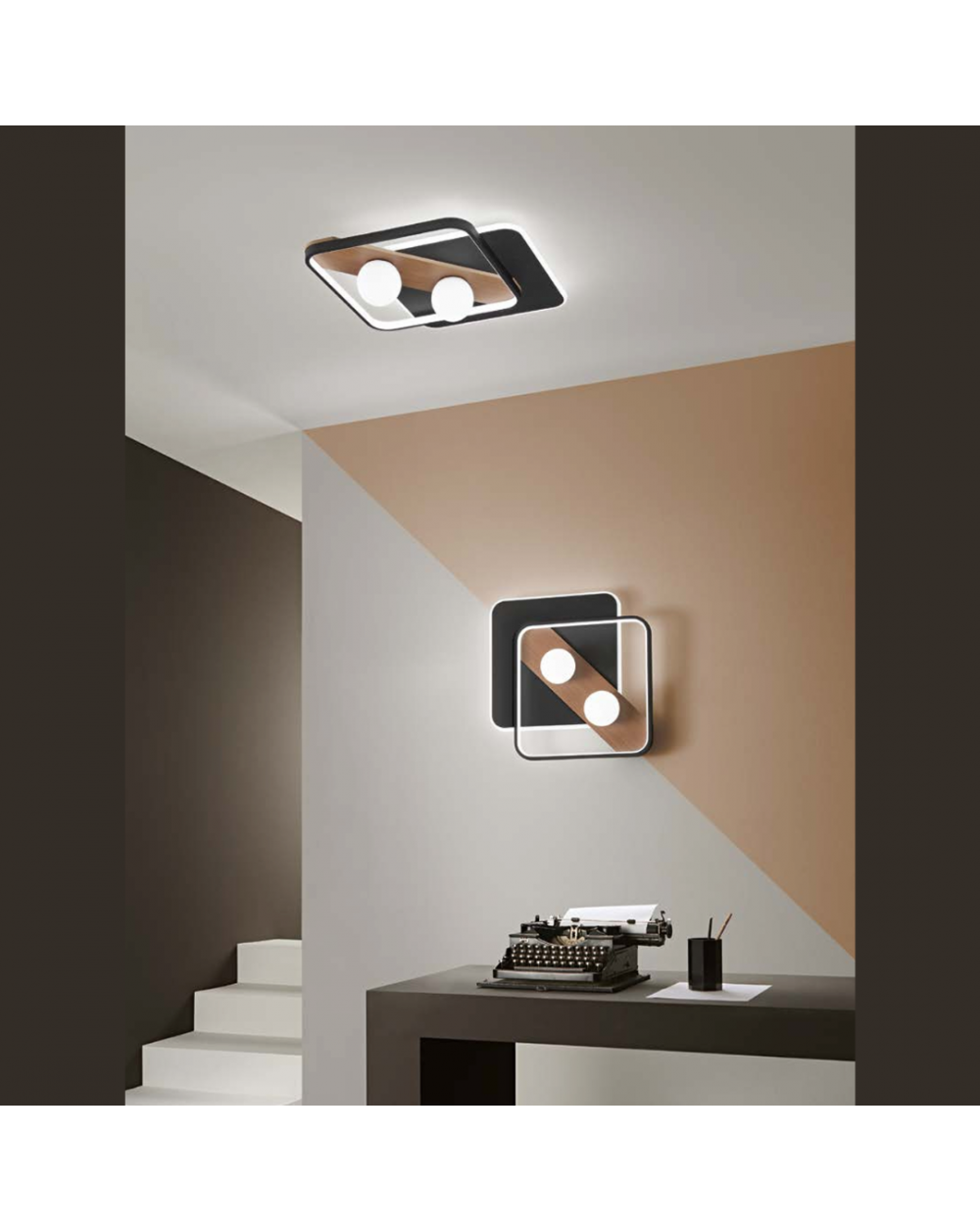 Plafoniera/Applique di forma quadrata con angoli smussati. Sfere in acrilico. Disponibile in bianco ed in nero.
