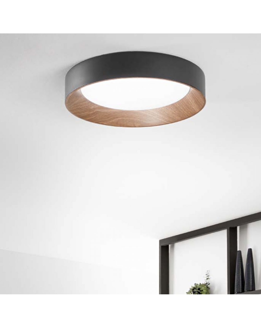 Plafoniera tonda con bordo in metallo e diffusore in acrilico. Esterno a scelta tra bianco e nero, interno effetto legno. Disponibile in due dimensioni.