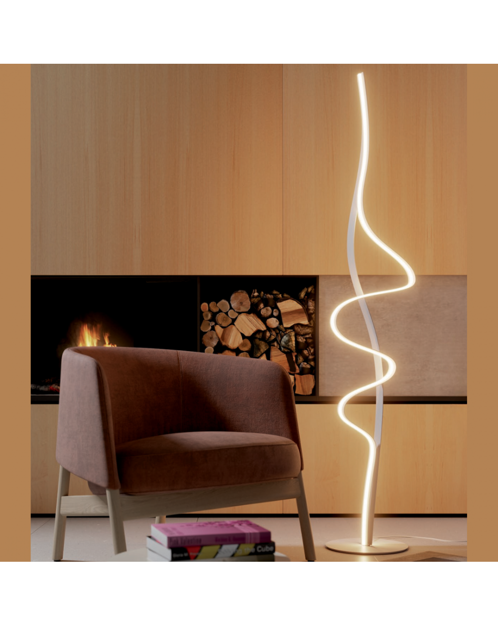 Lampada da terra per interni, dotata di LED SMD, struttura in metallo e alluminio verniciata a polveri bianco opaco, nero opaco o con finitura oro opaco; diffusore in PVC bianco.