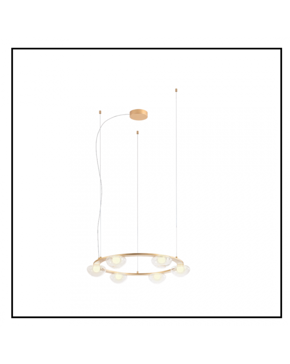 Sospensione per interni equipaggiata con LED SMD, struttura in metallo verniciato oro opaco o nero opaco, doppi diffusori in vetro PYREX trasparente all'esterno e bianco satinato all'interno.