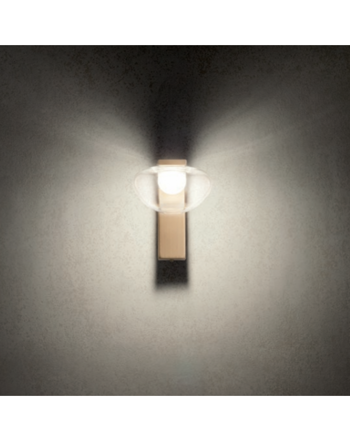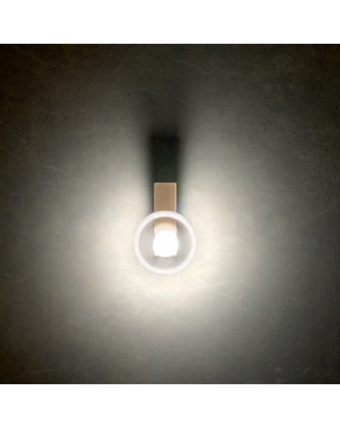 Applique per interni equipaggiata con LED SMD, struttura in metallo verniciato oro opaco o nero opaco, doppi diffusori in vetro PYREX trasparente all'esterno e bianco satinato all'interno.