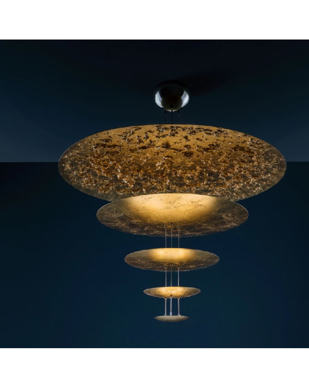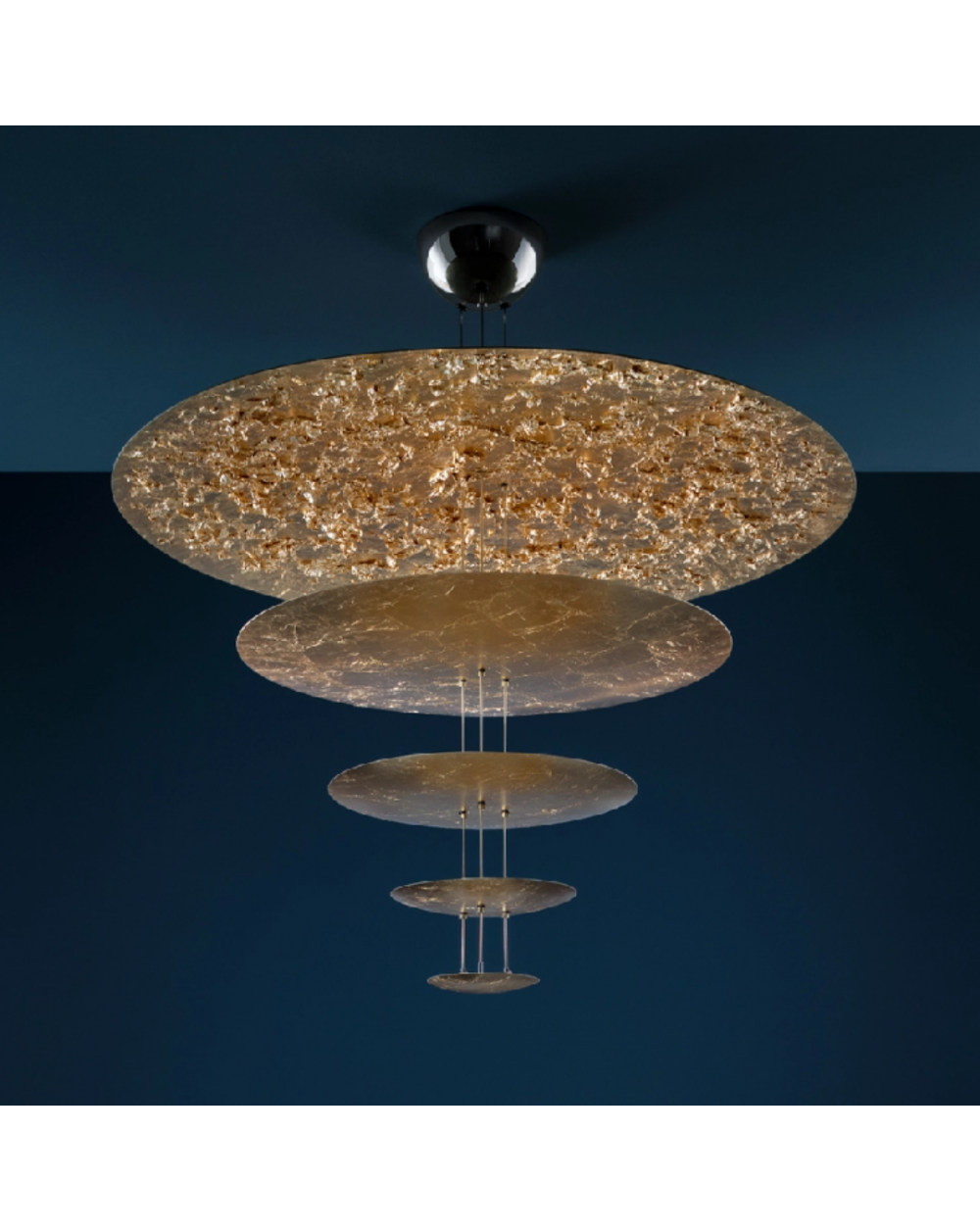 Lampada a sospensione con dischi diffusori in alluminio rivestiti in foglia, aste in ottone o alluminio, base nickel.