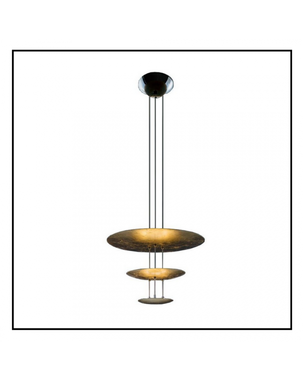 Lampada a sospensione con dischi diffusori in alluminio rivestiti in foglia, aste in ottone o alluminio, base nickel.