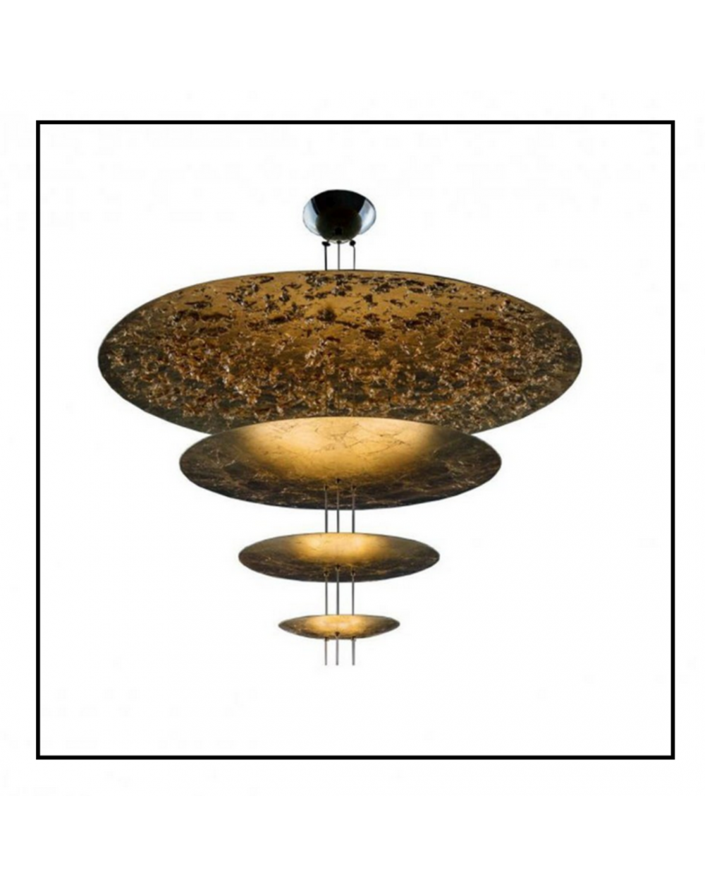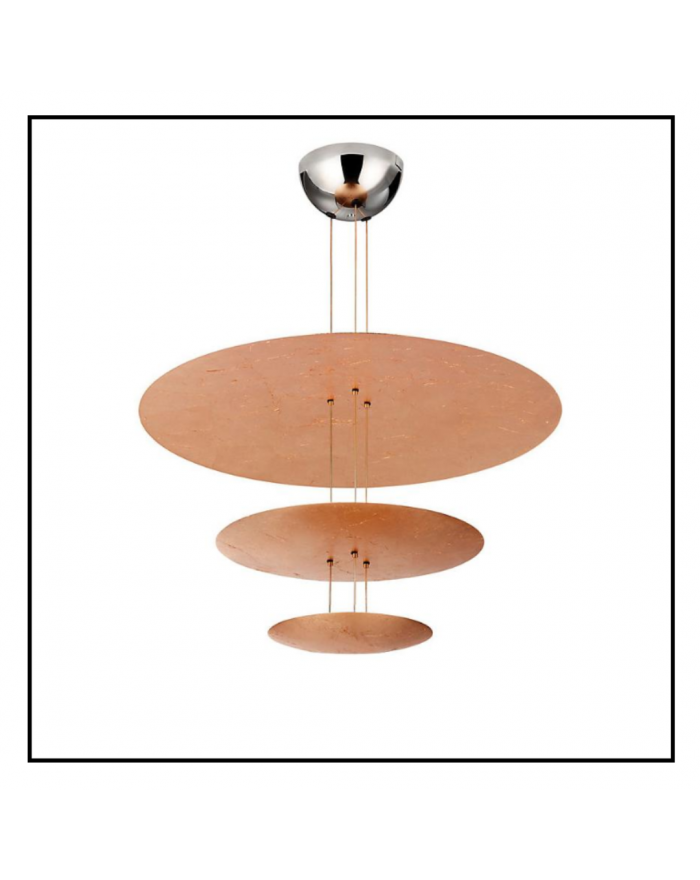 Lampada a sospensione con dischi diffusori in alluminio rivestiti in foglia, aste in ottone o alluminio, base nickel.