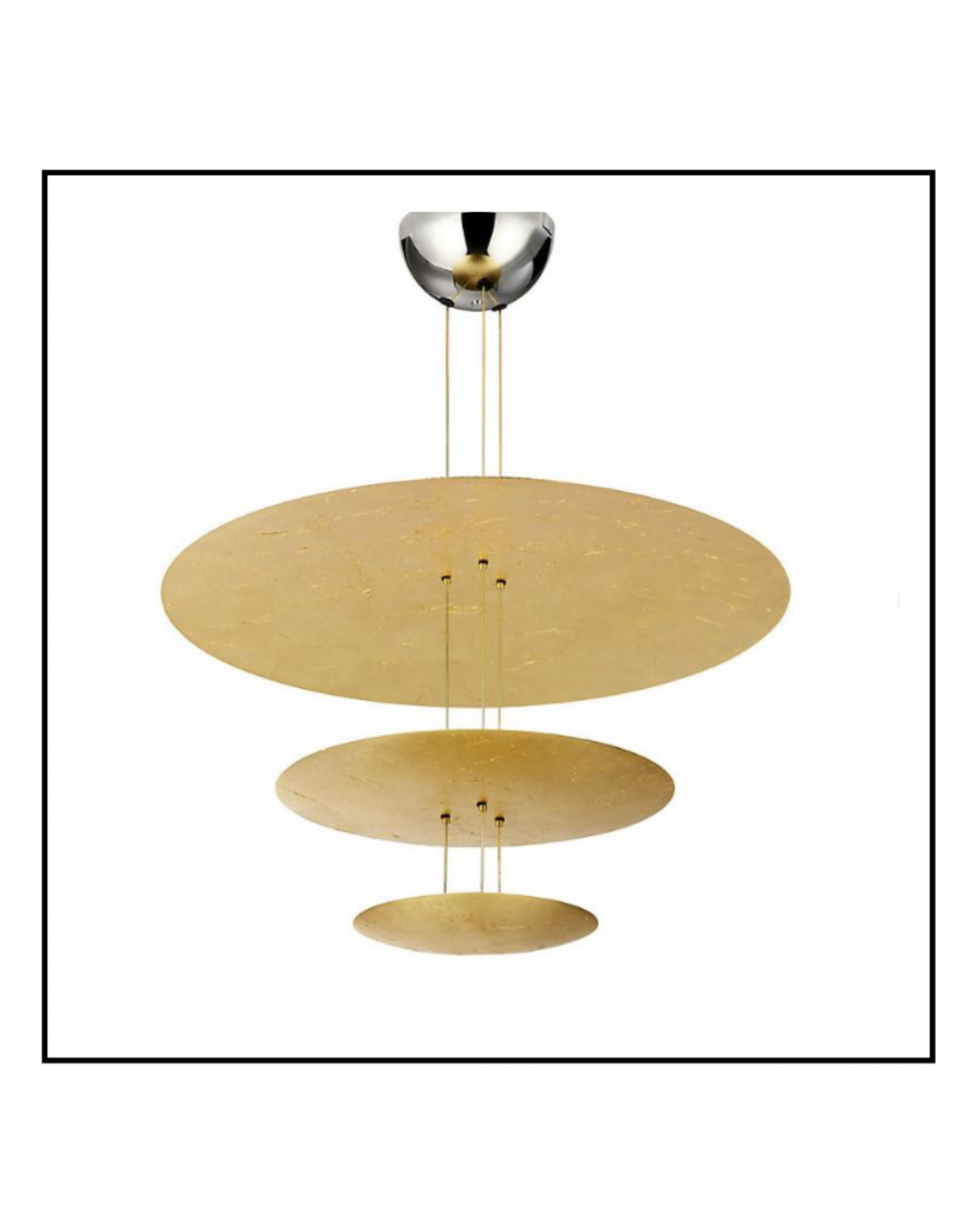 Lampada a sospensione con dischi diffusori in alluminio rivestiti in foglia, aste in ottone o alluminio, base nickel.