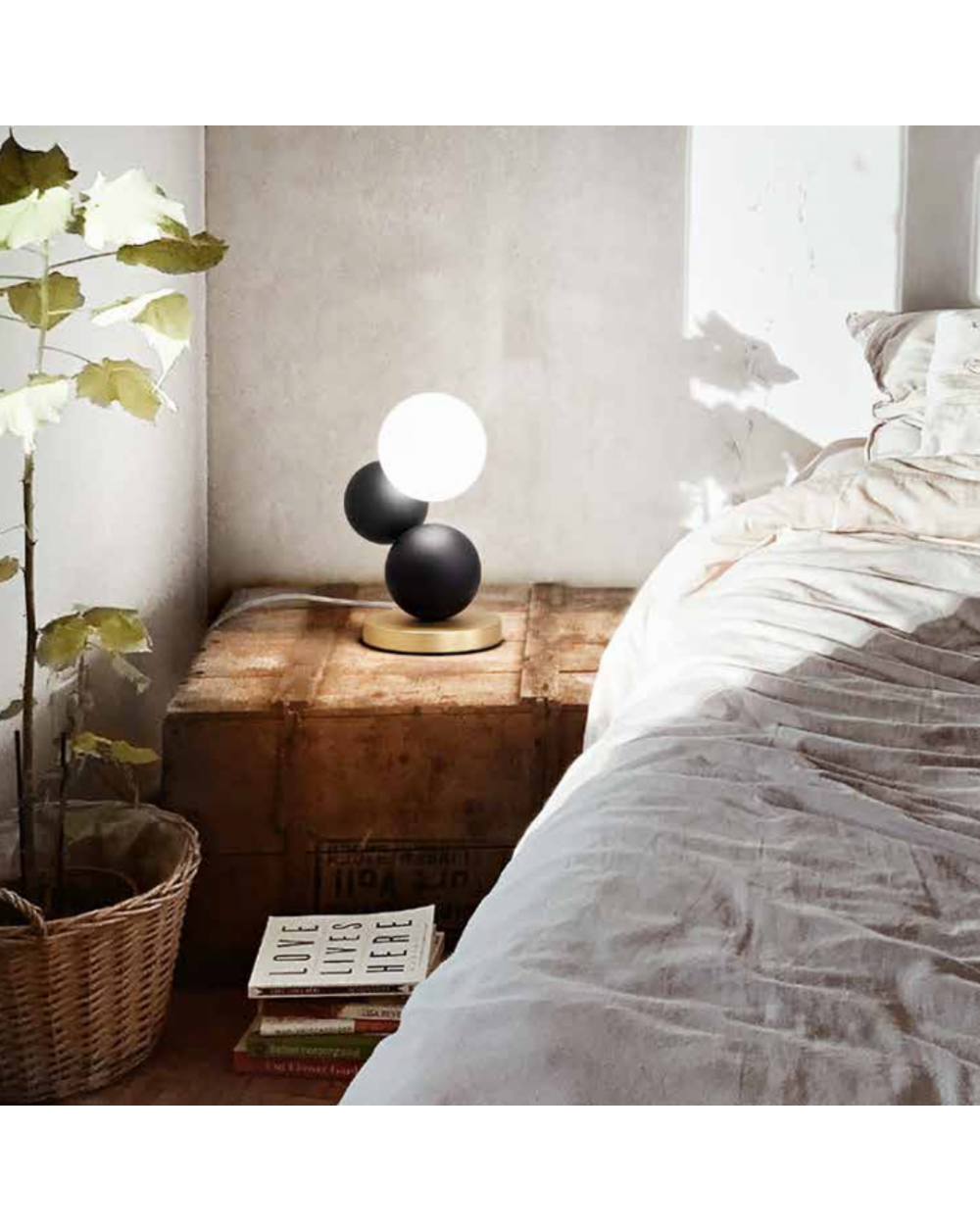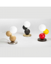 Lampada da tavolo con struttura in metallo, legno e vetro soffiato. Regolazione luce al tocco. Disponibile nei colori nero, quercia e giallo/rosso/nero.