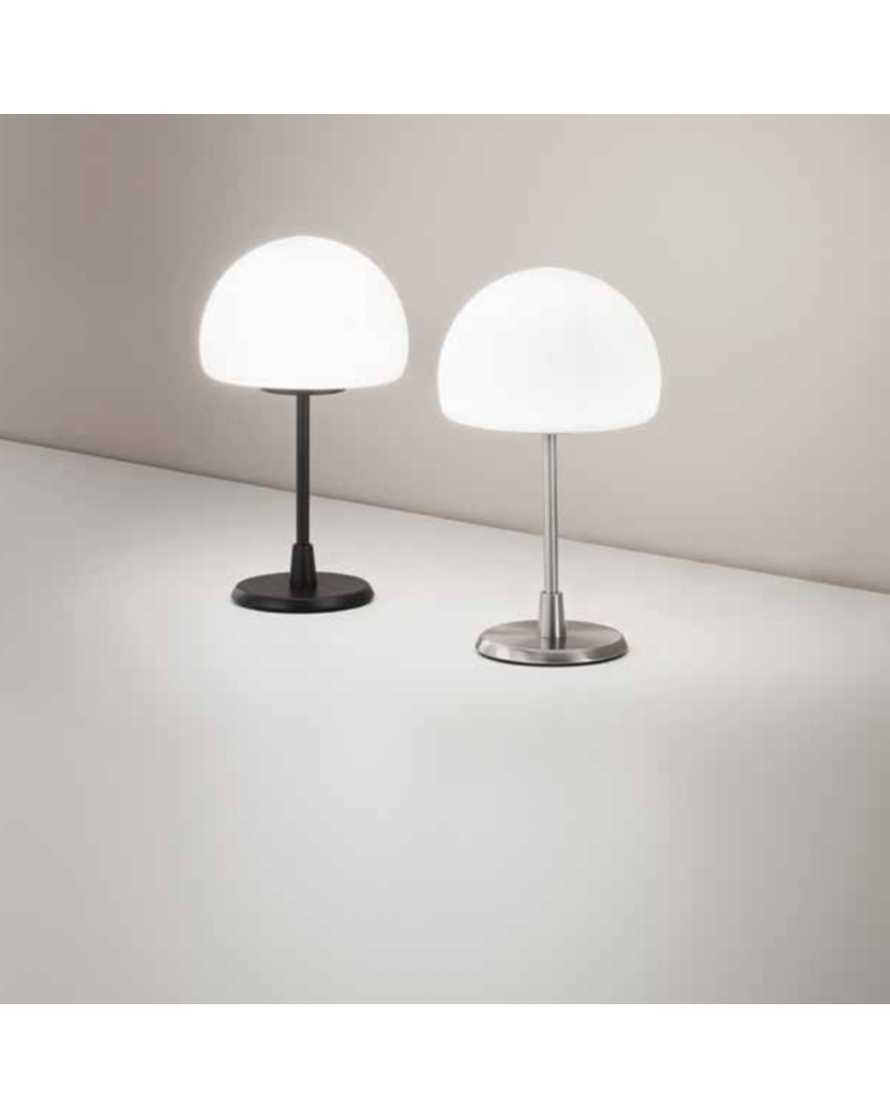 Lampada da tavolo con struttura in metallo e vetro soffiato e con regolazione luce al tocco. Disponibile nei colori nero e nichel satinato.