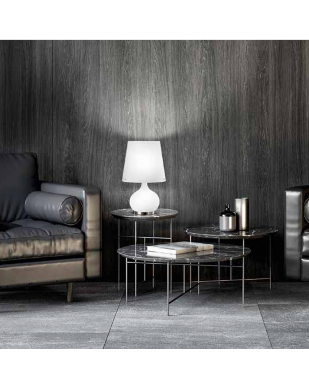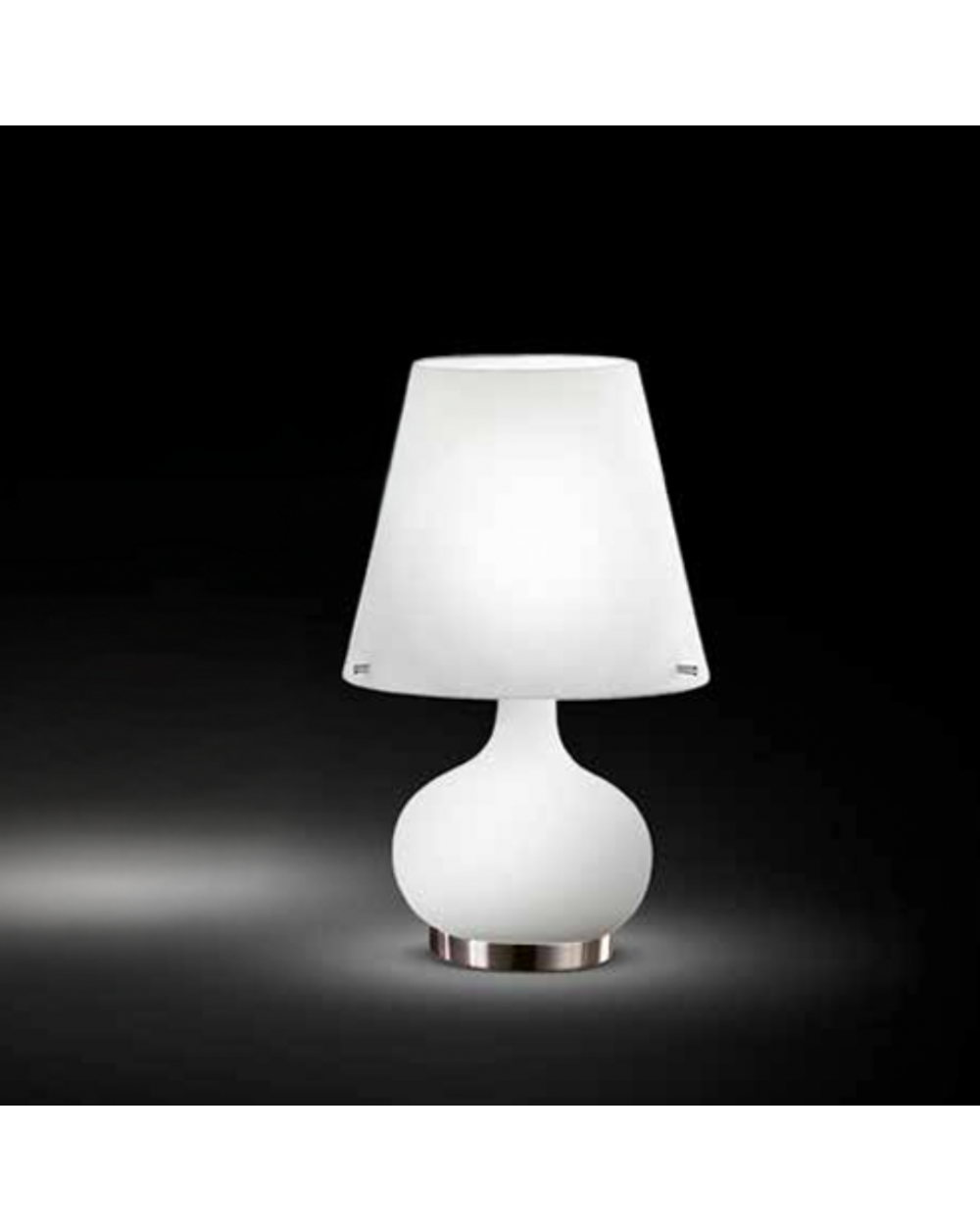 Lampada bianca da tavolo con struttura in metallo e vetro soffiato disponibile in due grandezze. Doppia accensione.