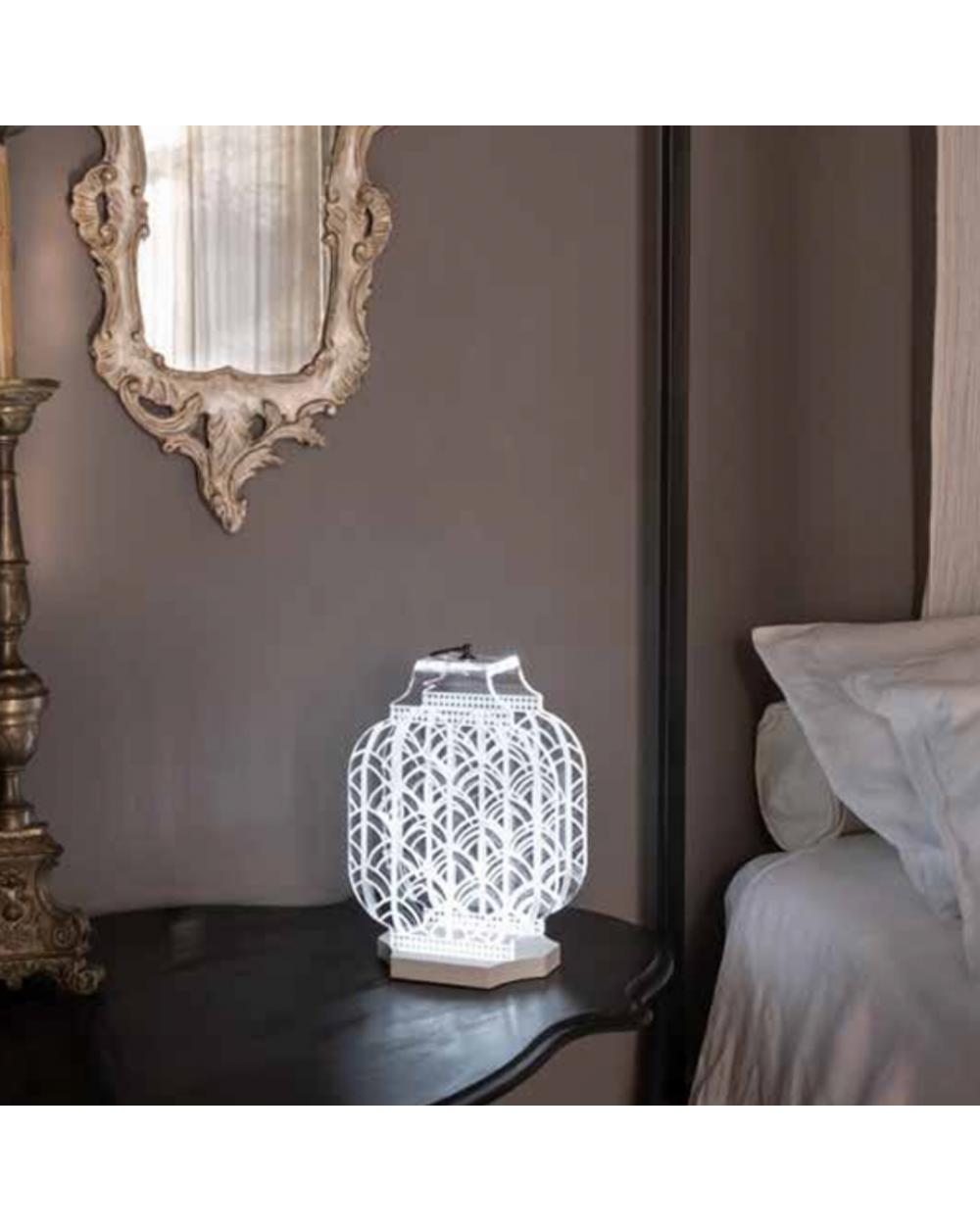 Lampada da tavolo ricaricabile in cristallo acrilico color avorio.