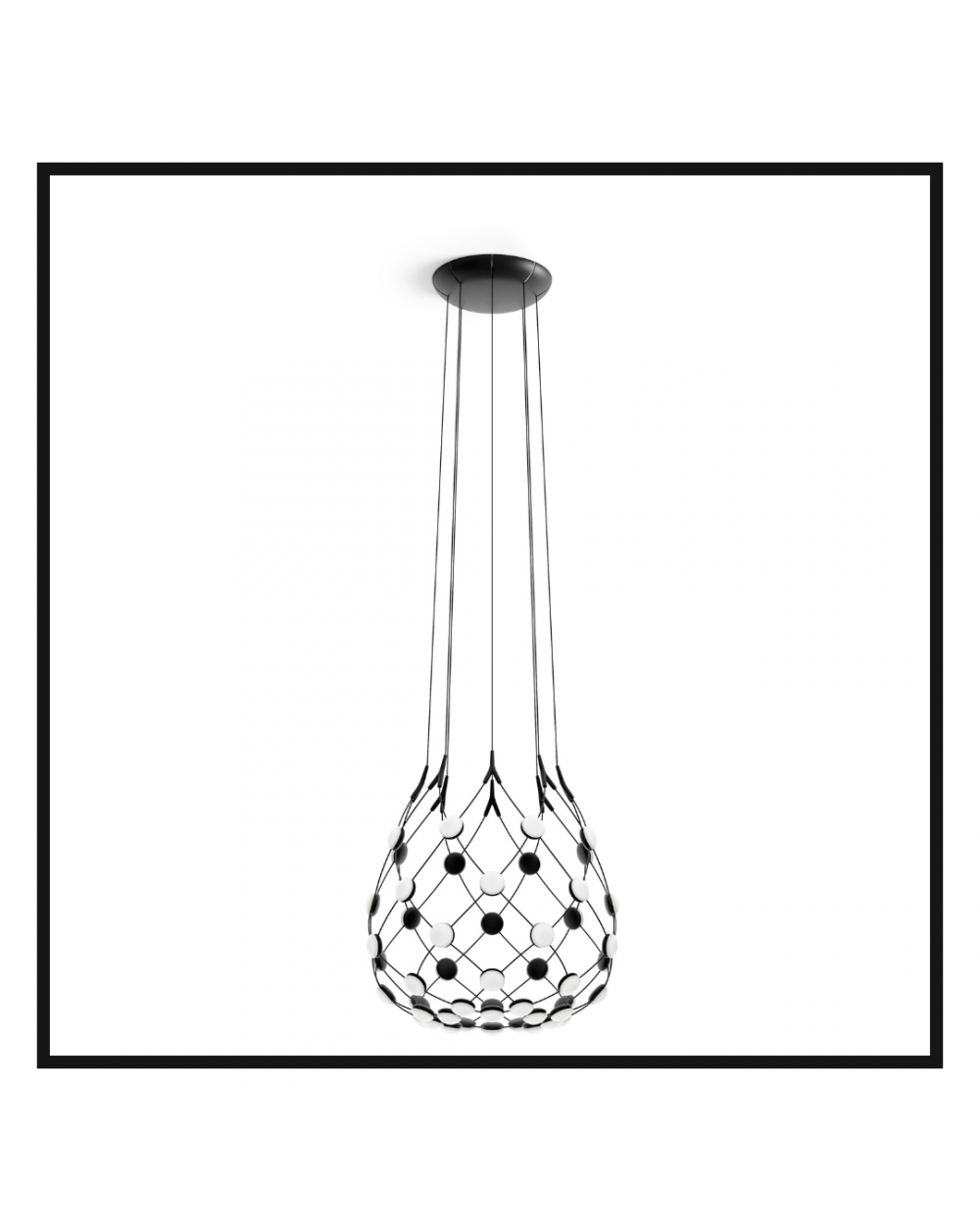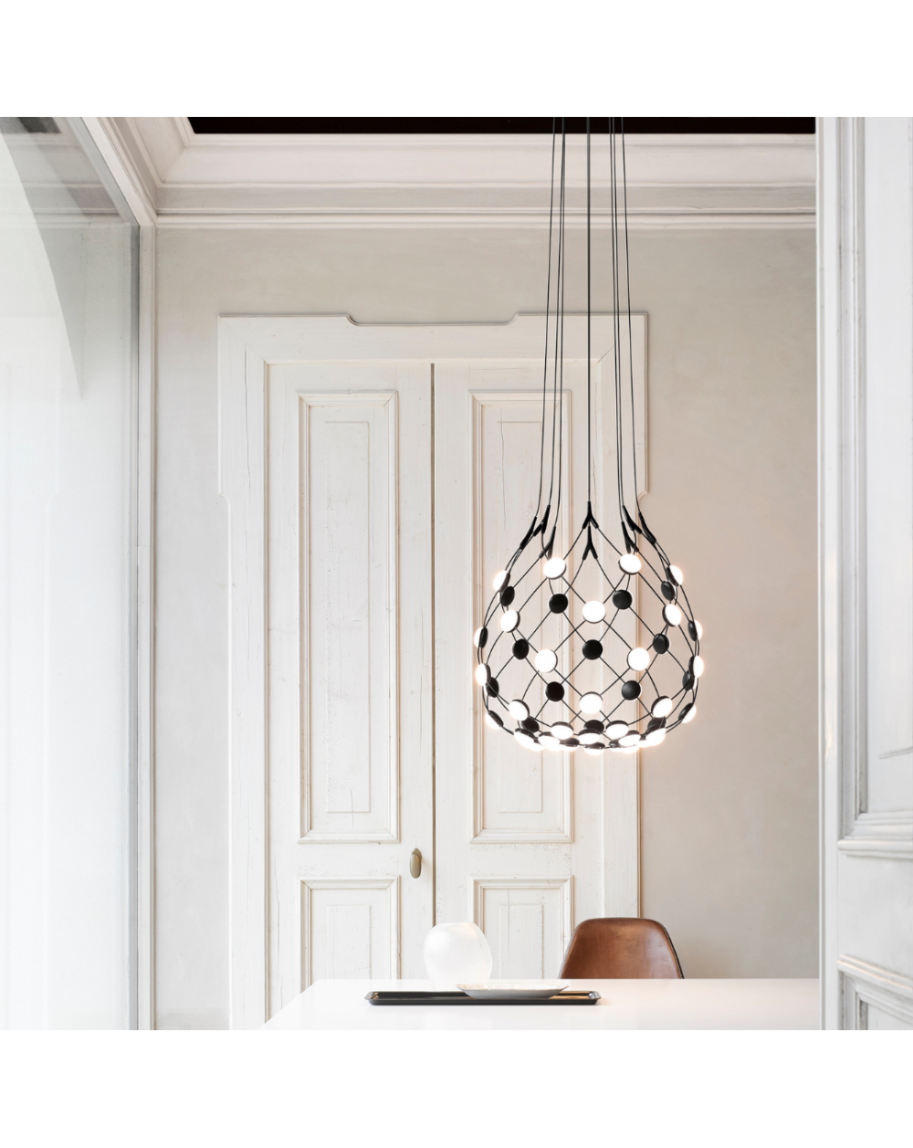 Lampada led a sospensione con struttura composta da una rete di cavi flessibili all’incrocio dei quali sono posizionate le sorgenti LED. La particolare struttura permette libertà nella gestione della luce: è possibile controllare l’intensità, ma anche scegliere quali settori o singoli punti di luce attivare. Possibilità di lunghezza del cavo 1m e 5 m.