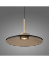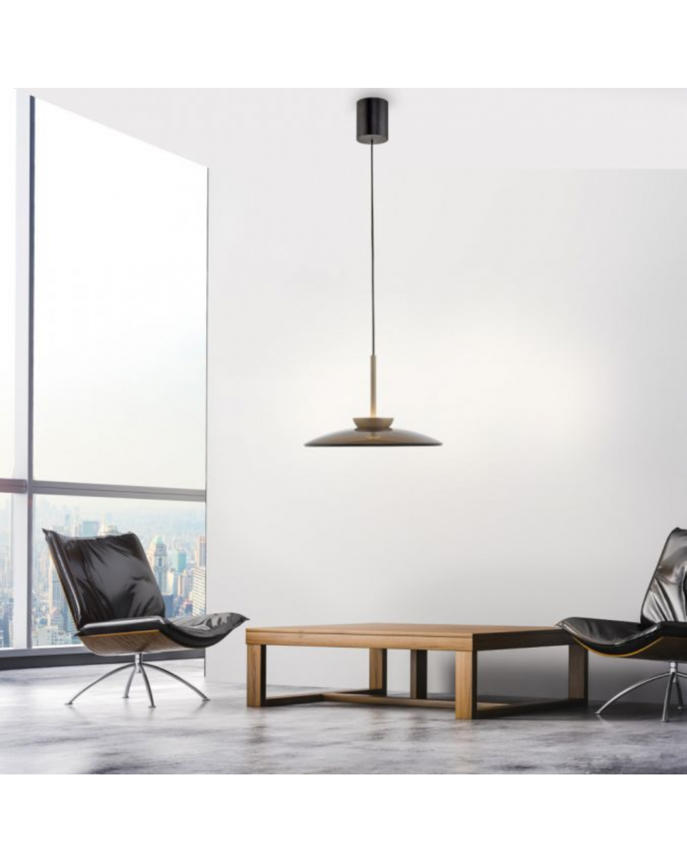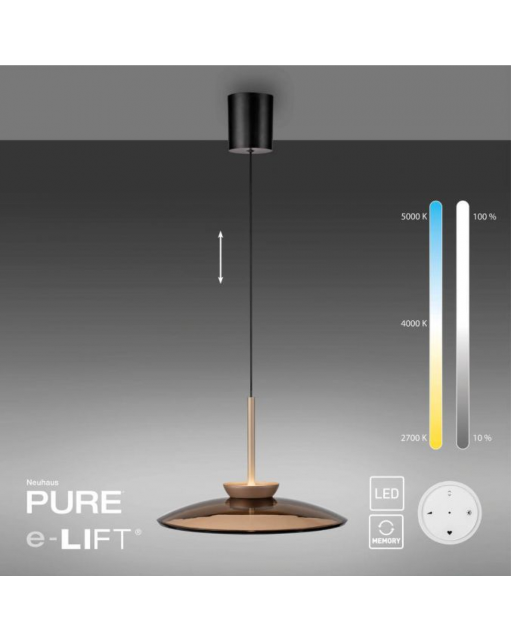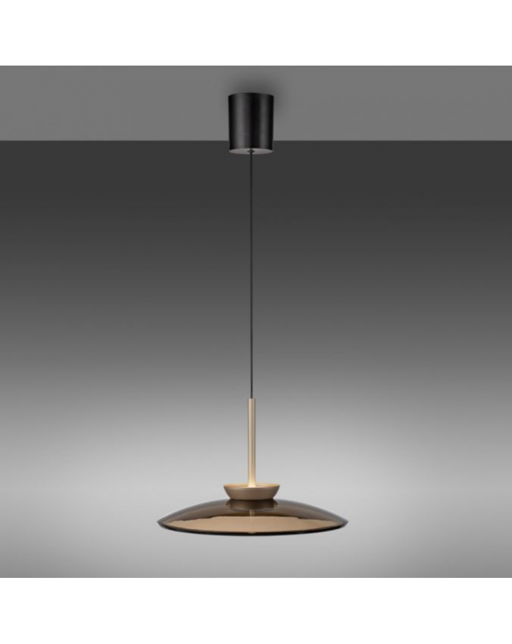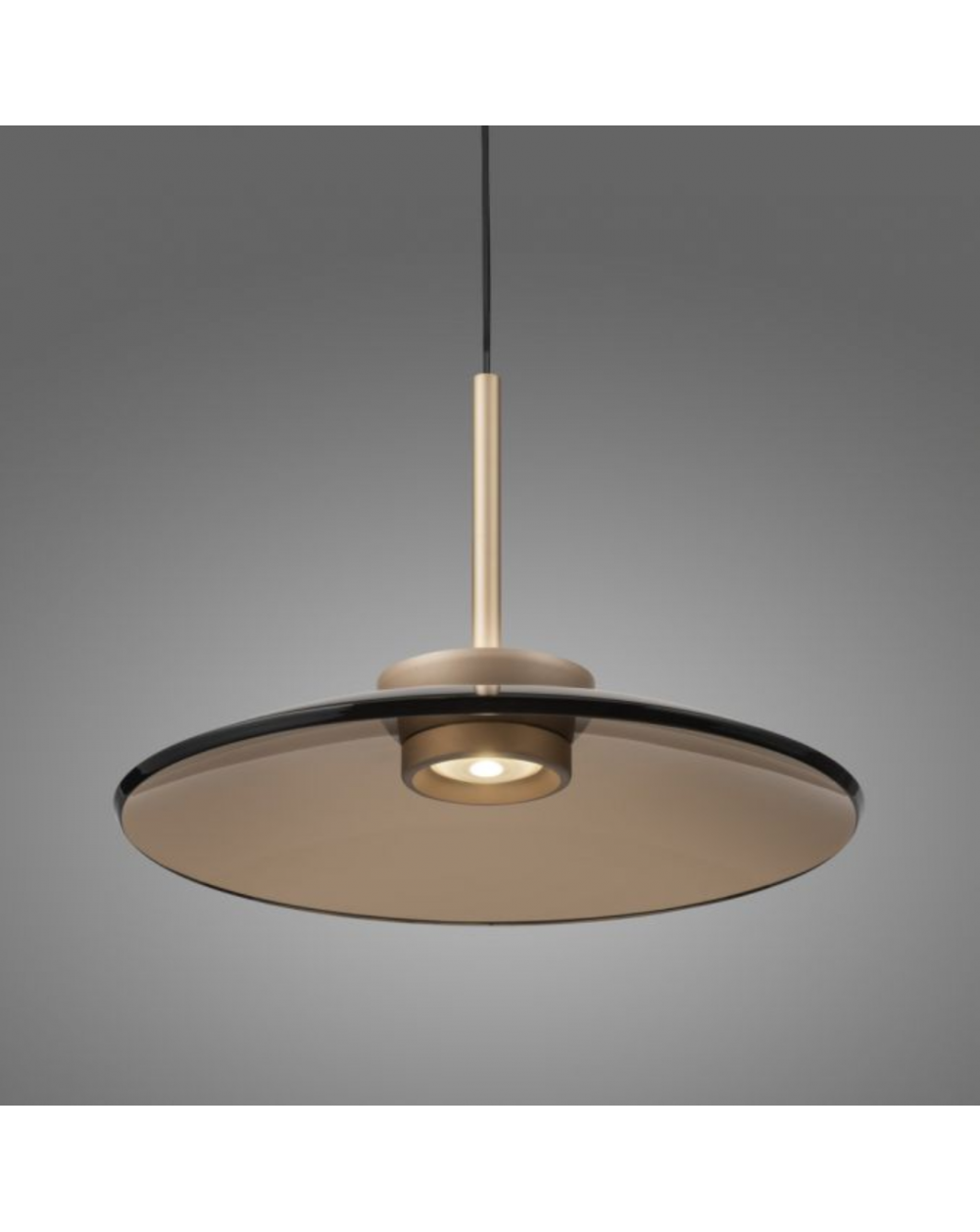Lampada a sospensione led color bronzo in vetro ambrato scuro. Dotata di regolazione elettrica dell'altezza. Possibilità di dimmerazione tramite telecomando wireless incluso. Controllo della temperatura colore, modificabile tra 2700 e 5000 Kelvin. Grazie alla funzione di memoria integrata, la lampada ricorda le impostazioni preferite e le ripristina con un semplice tocco. Telecomando con supporto a parete incluso.