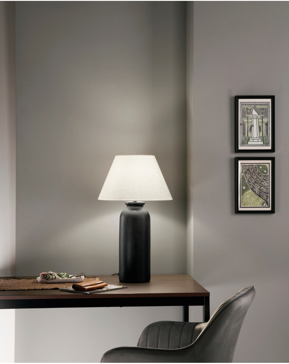 Lume con base in ceramica colore moro e paralume in tessuto