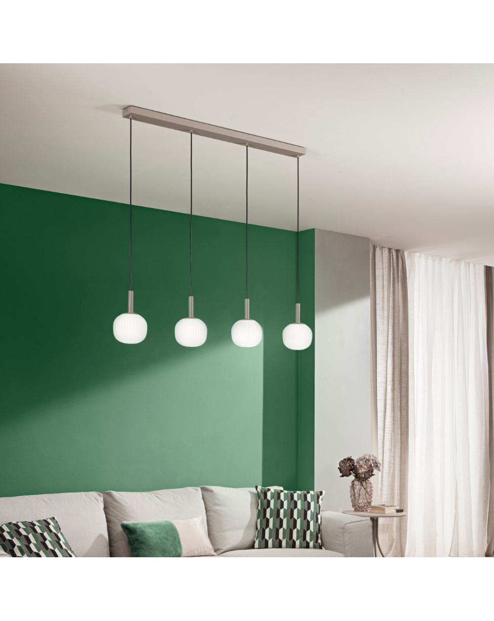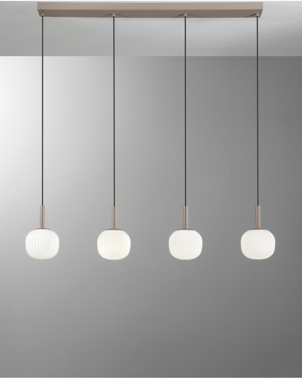 Sospensione dallo stile contemporaneo, con montatura in metallo color sabbia e diffusori in vetro bianco latte.