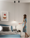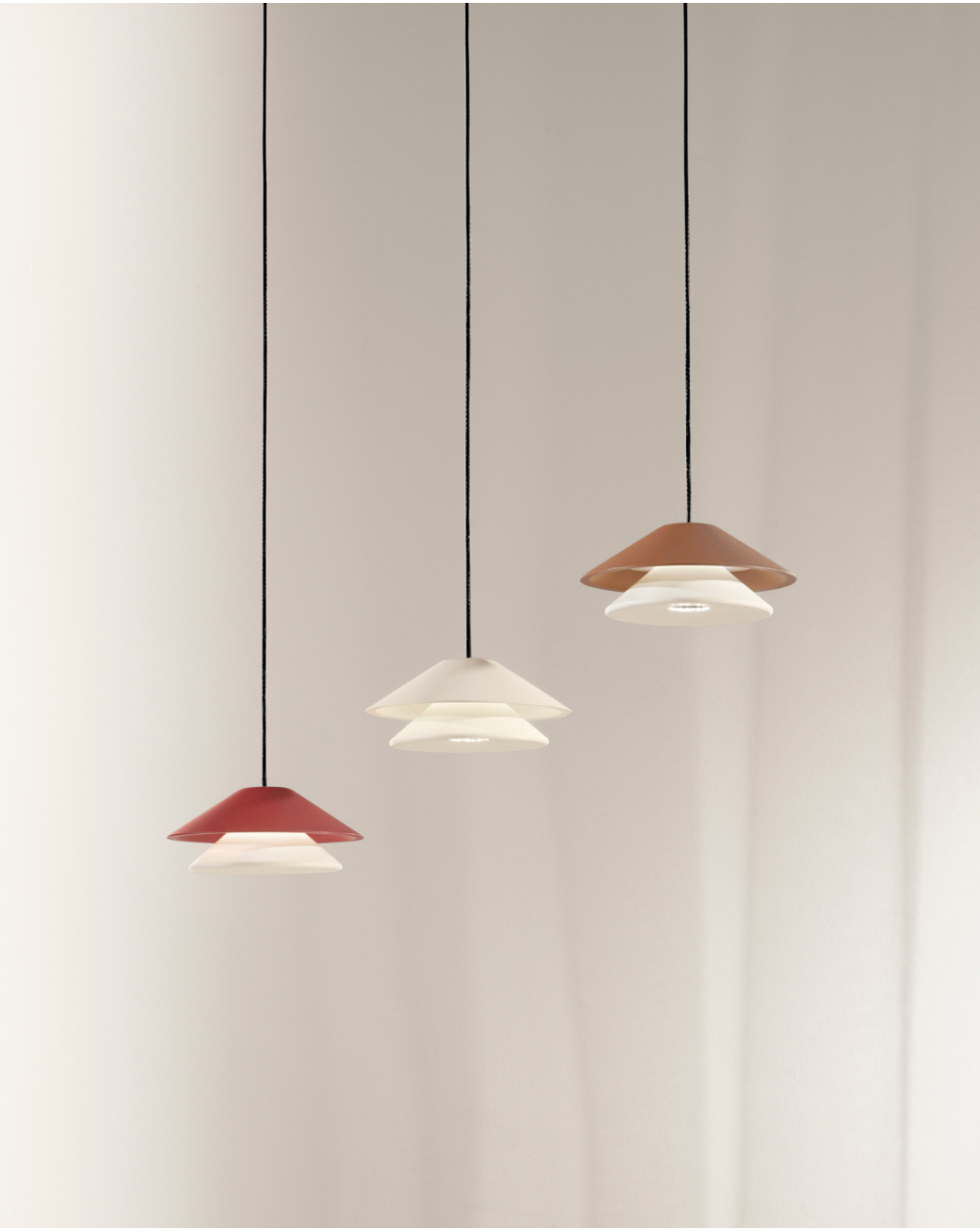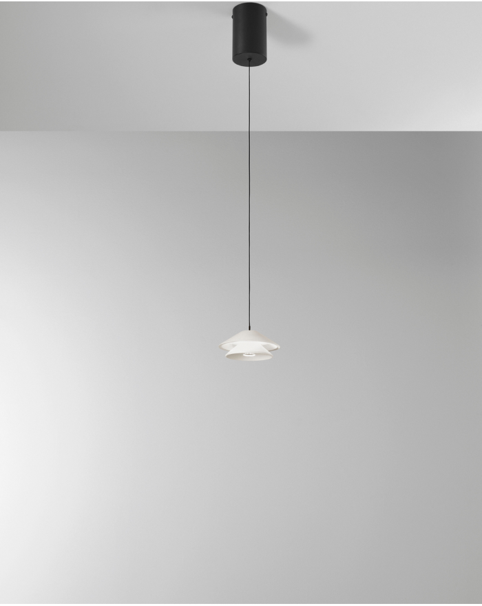 Sospensione con Led integrato dalla forma conica in metallo, disponibile in tre varianti di colore.