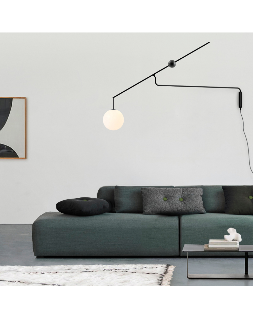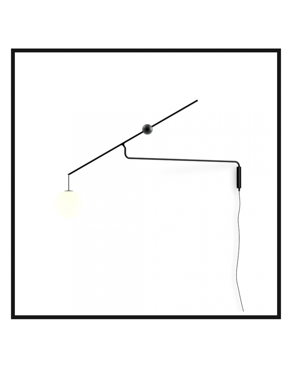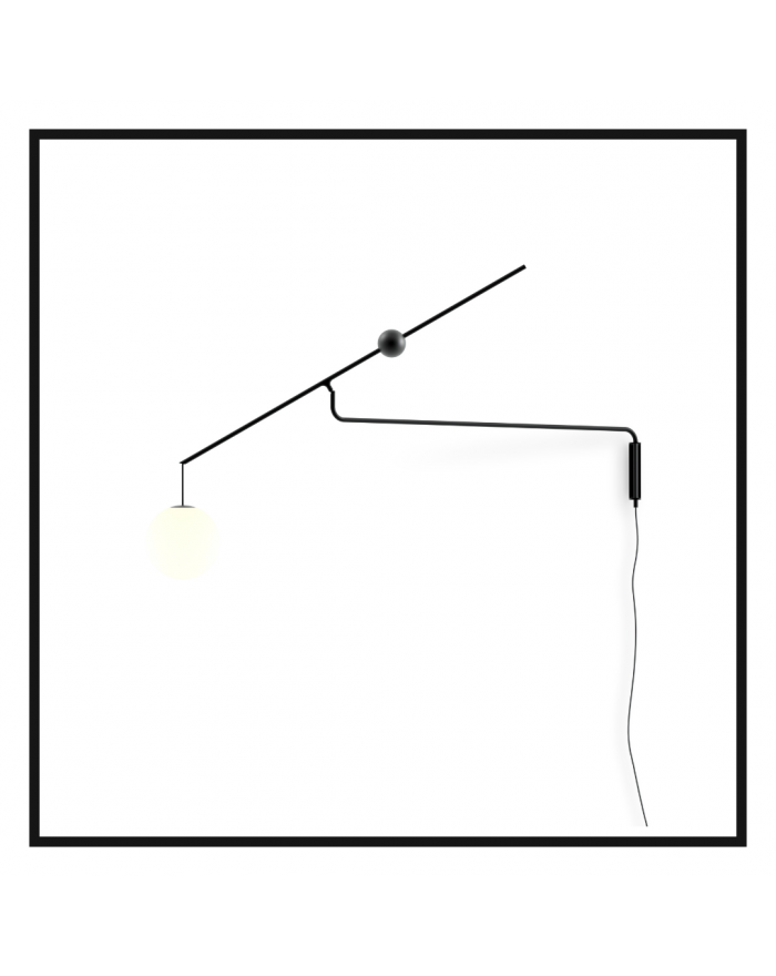 Lampada da parete da interni con struttura in acciaio e diffusore in vetro soffiato opale. Disponibile in nero opaco o in ottone spazzolato. La versione da parete è dotata di due bracci articolati che, sfruttando il movimento del contrappeso, offrono grande flessibilità nel posizionamento del diffusore. Dimmerabile.