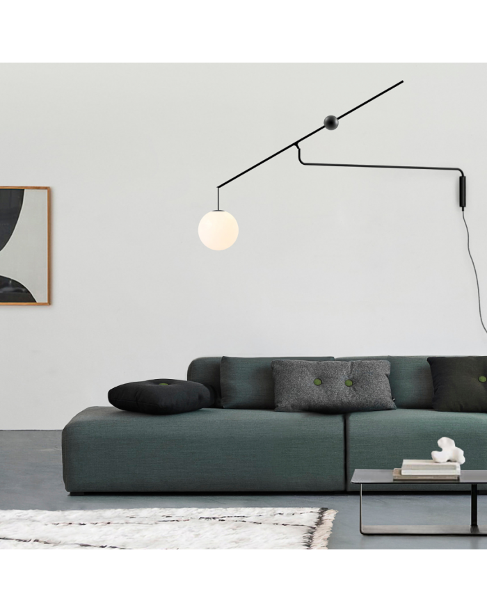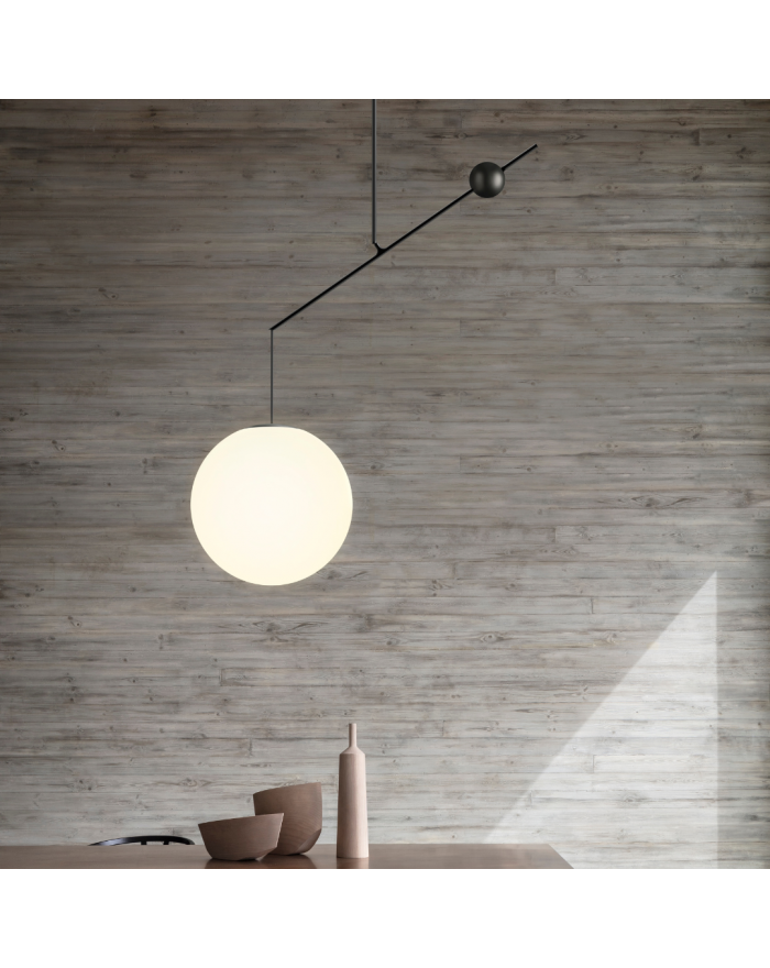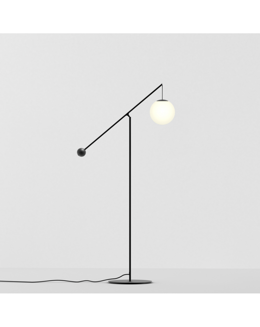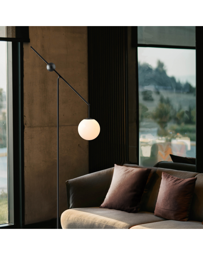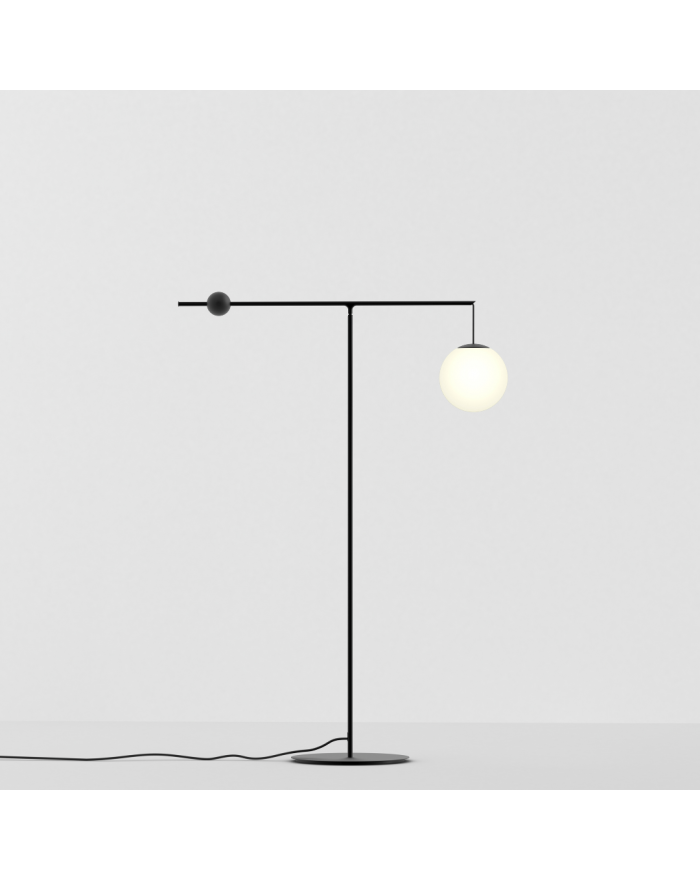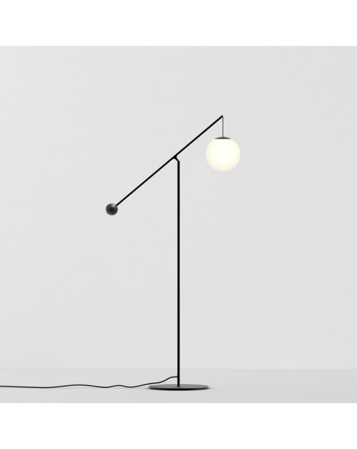 Lampada da terra da interni con struttura in acciaio e diffusore in vetro soffiato opale. Disponibile in nero opaco o in ottone spazzolato. Dimmerabile. La lampada assume diverse posizioni tramite l'uso di un contrappeso. Premendo il pulsante sulla parte superiore della base, il fissaggio viene rilasciato e il contrappeso è libero di scorrere lungo la trave, permettendo al diffusore di essere spostato verso l'alto e verso il basso.