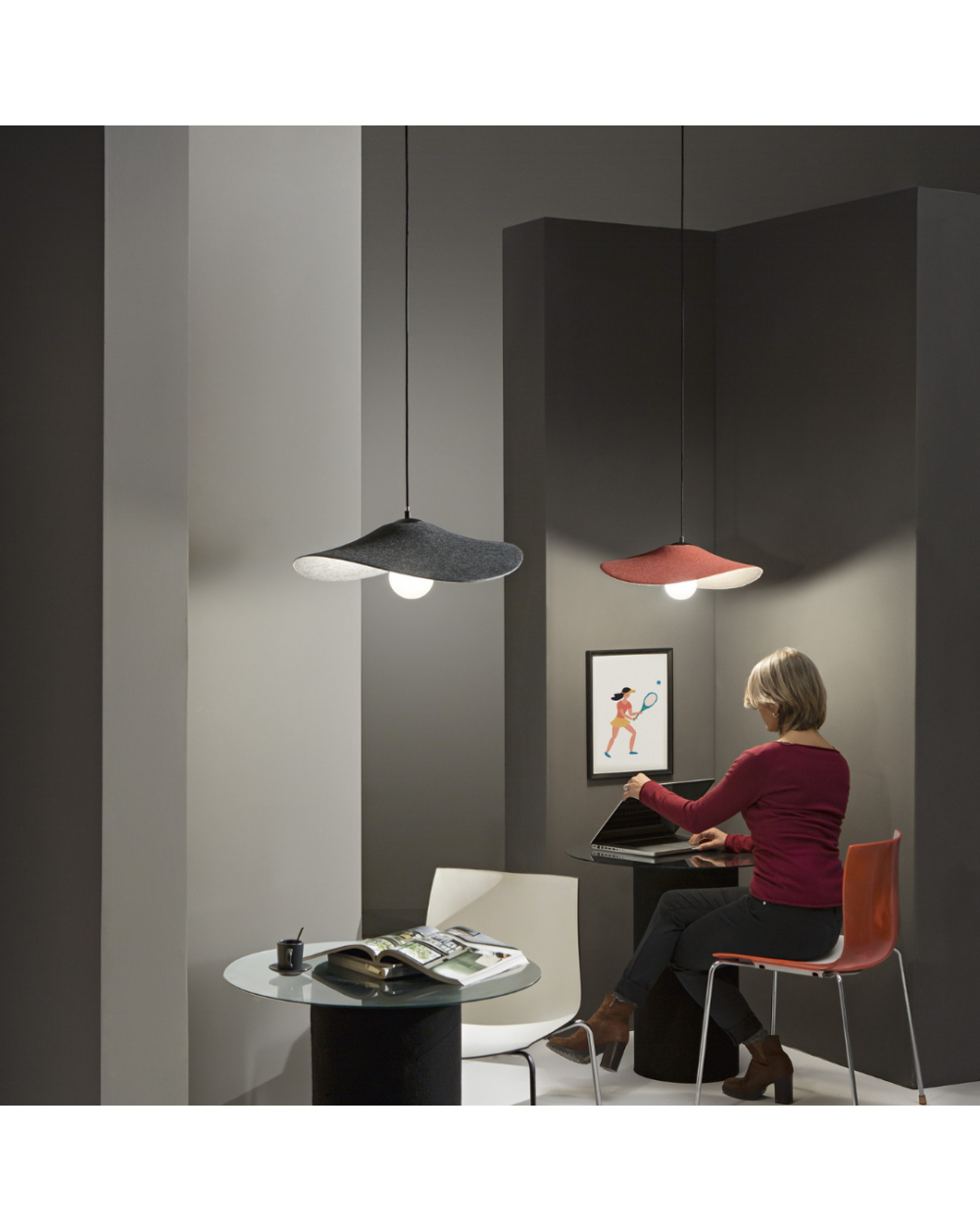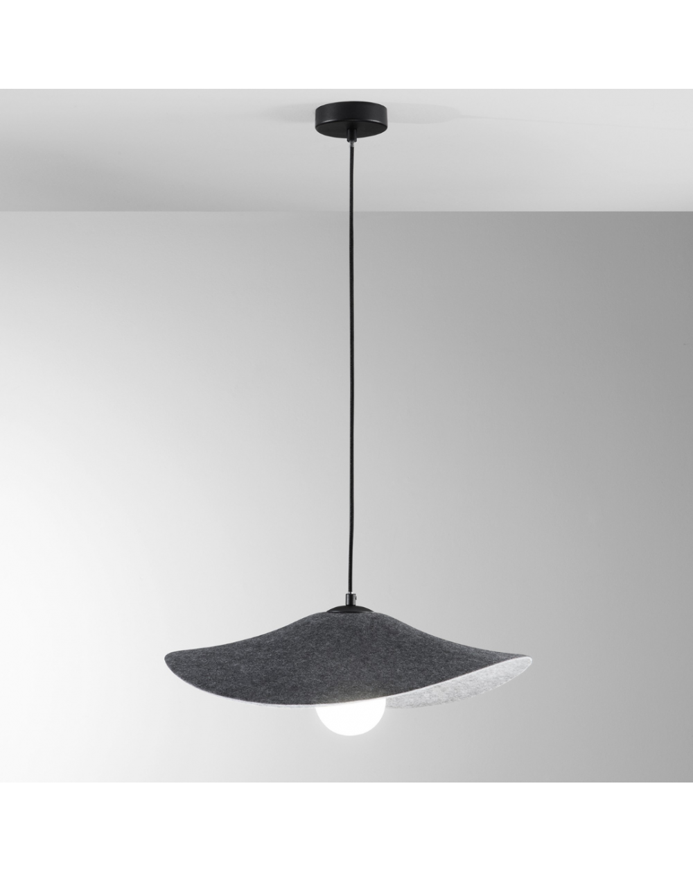 Sospensione 1 luce in feltro, disponibile in due varianti di colore: nero o arancio.