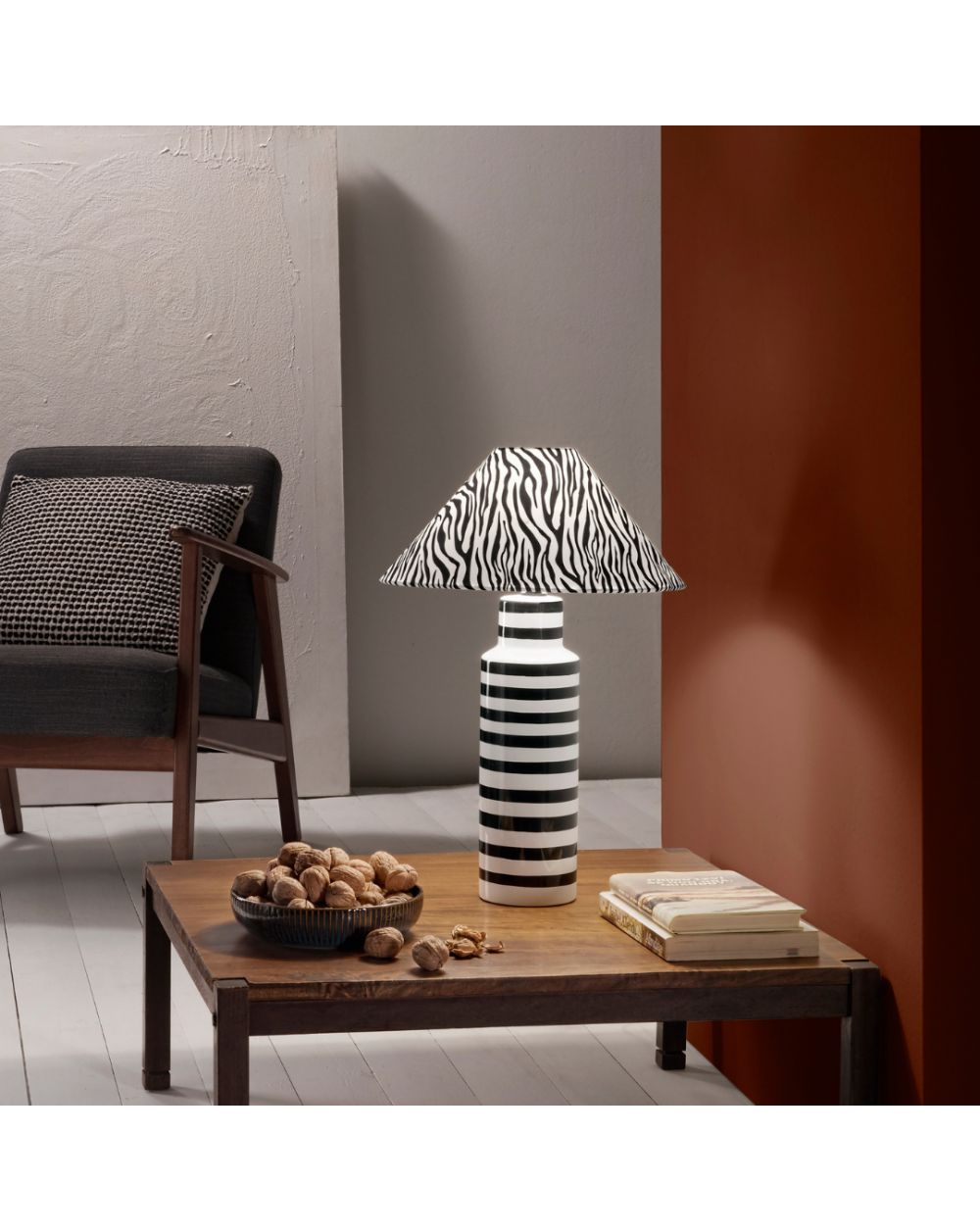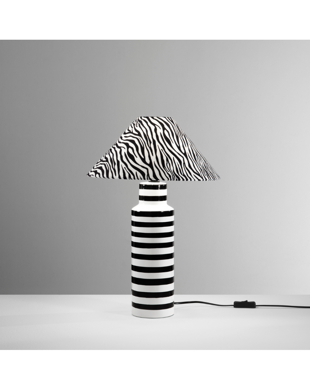 Lampada da appoggio realizzata con base in ceramica e paralume in tessuto con un sofisticato effetto zebrato