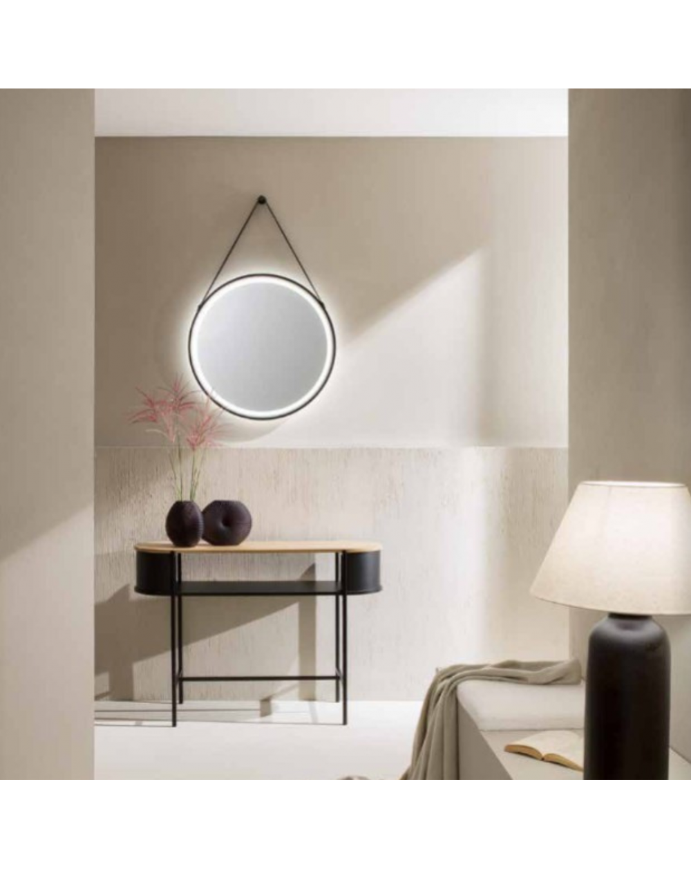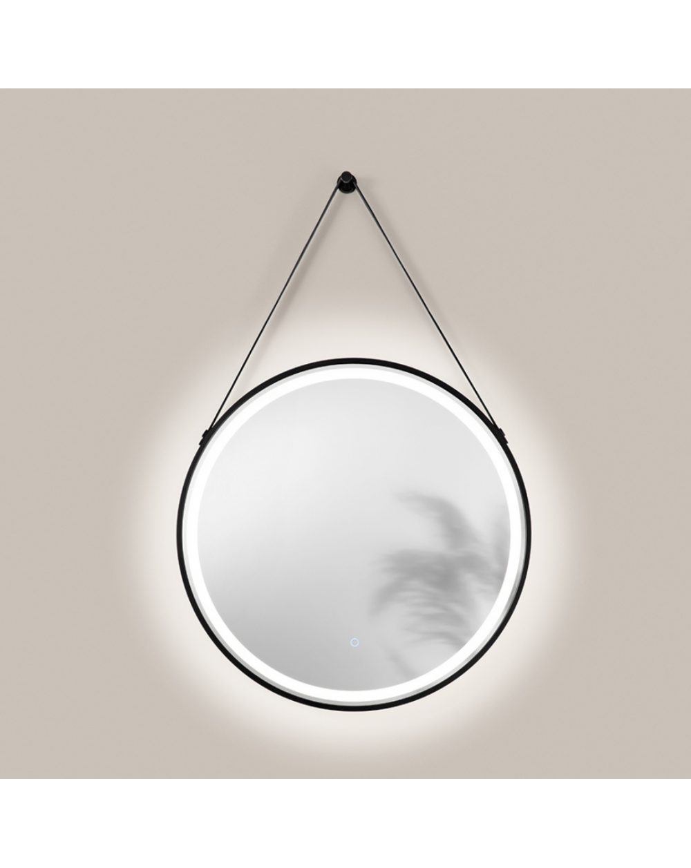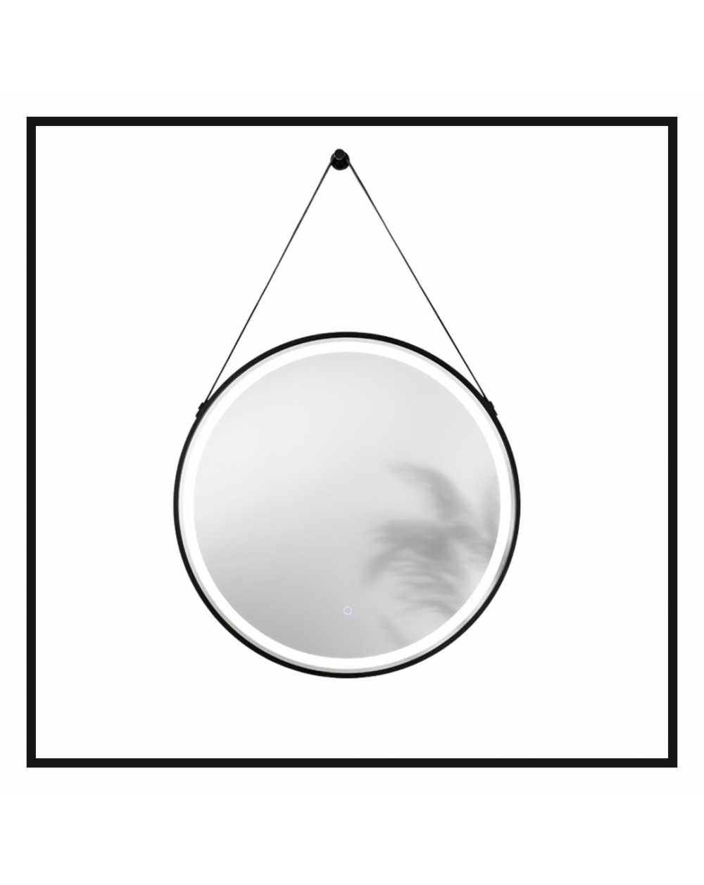 Specchio da 4mm, argento senza rame. Cornice e telaio in PC con cintura in ecopelle. Pellicola antideflagrante sul retro dello specchio. Riflettore bianco satinato Driver incluso. CCT 3000K/4000K/6500K. Nero.