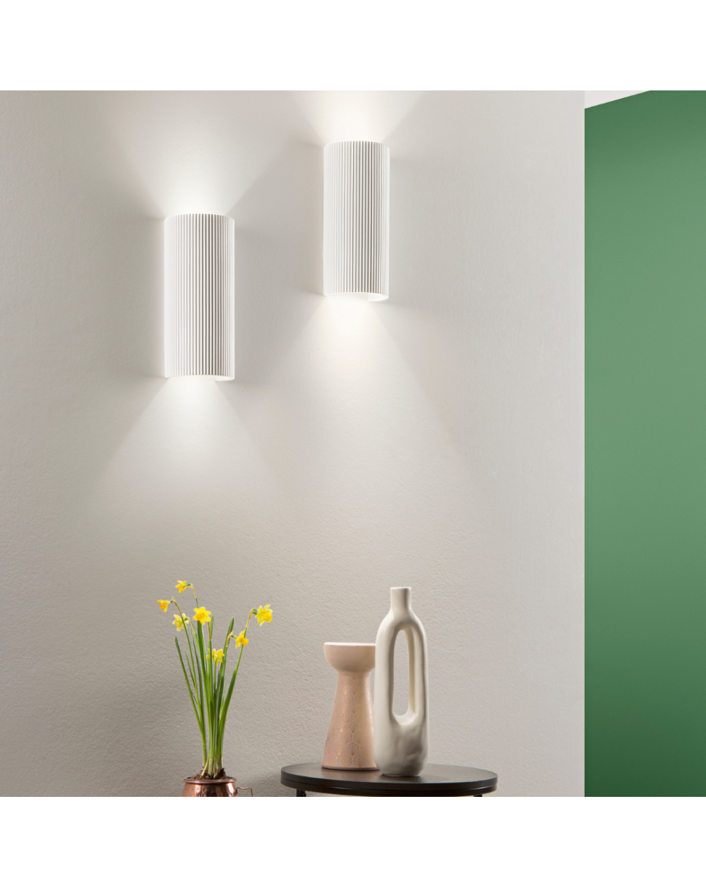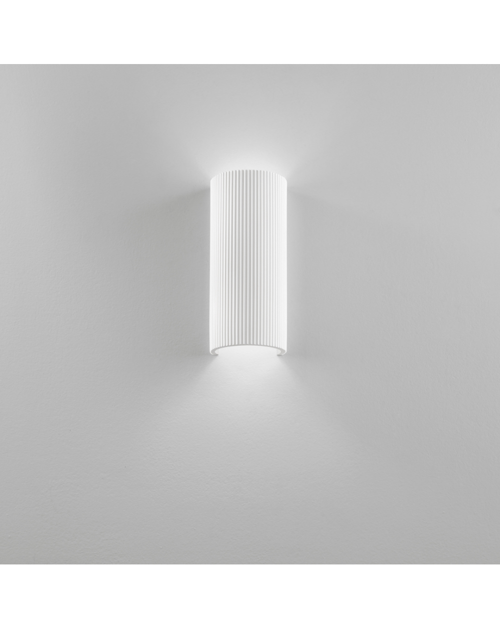 Applique realizzata in gesso. Caratterizzata da una forma cilindrica e da una superficie plissettata.
