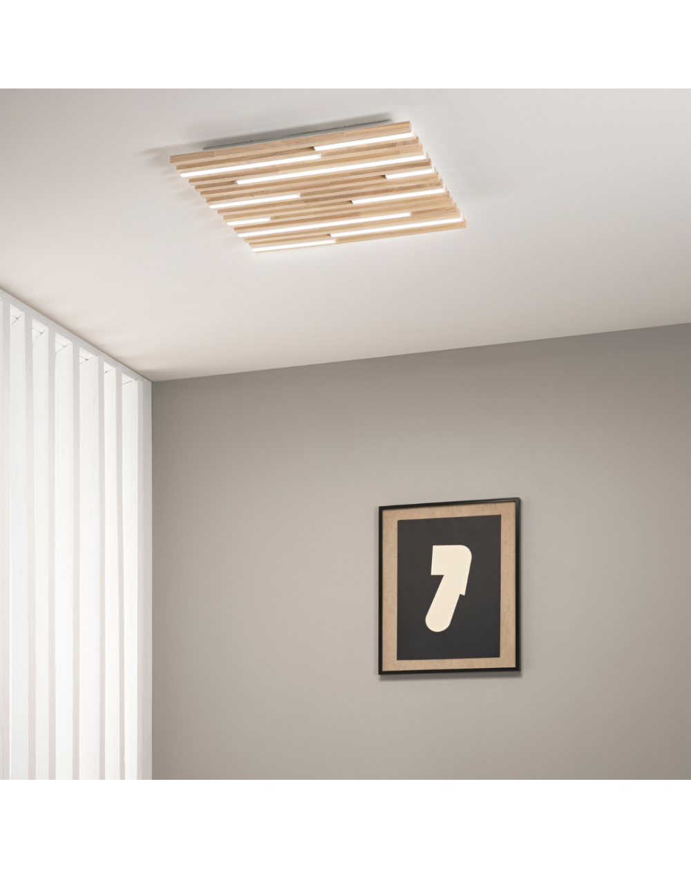 Plafoniera Led decorata con listelli in legno naturale.
