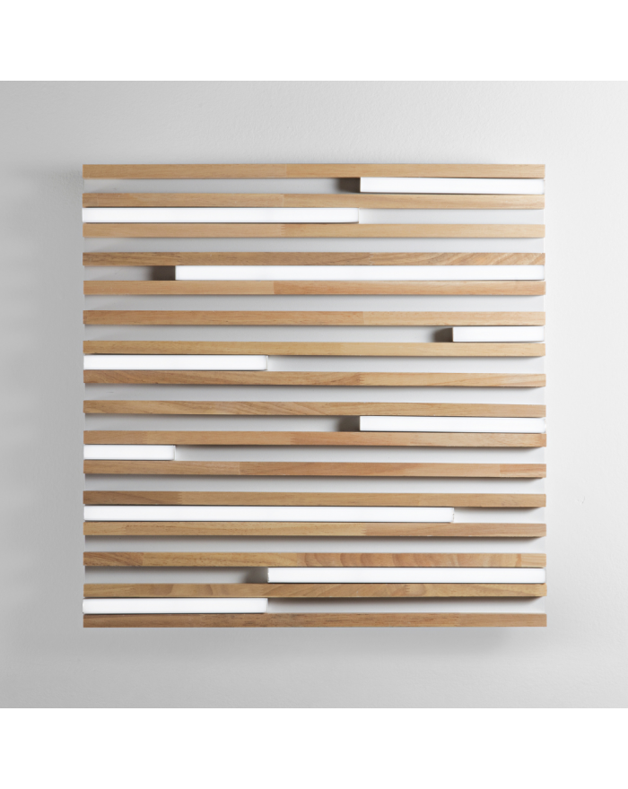 Disponibile in due dimensioni e nelle varianti cromatiche di legno d'acero su base bianca e in legno rovere Teak su base nera