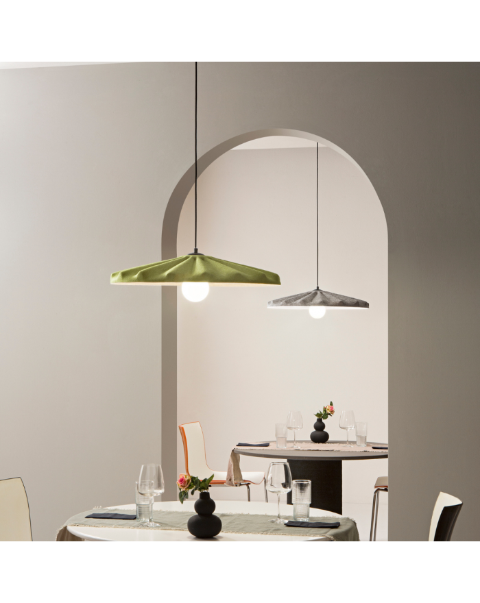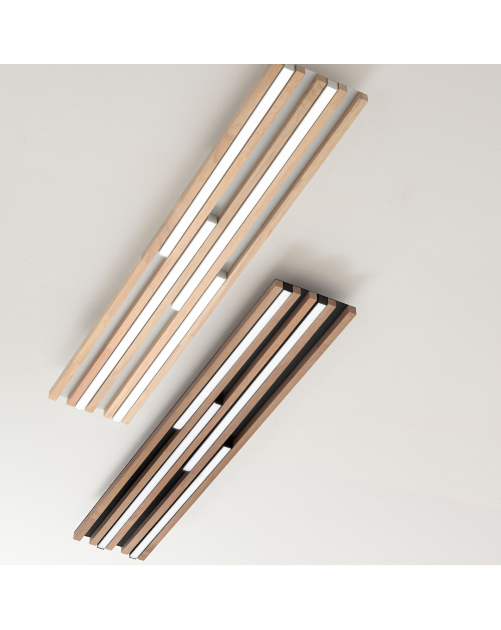 Plafoniera Led decorata con listelli in legno naturale.