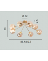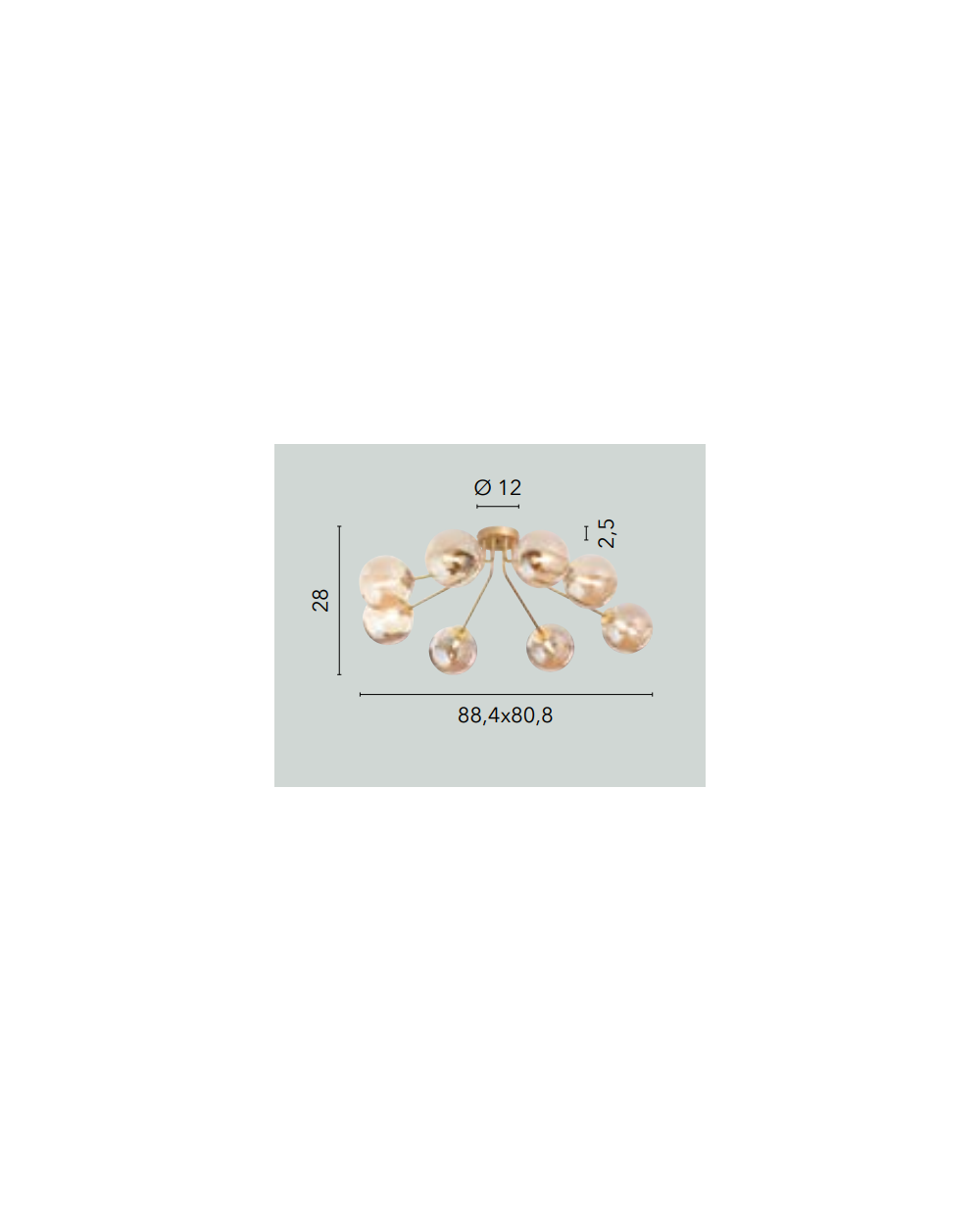 Plafoniera 8 luci disponibile nelle varianti di colore nero opaco con diffusori in vetro soffiato fumè oppure in ottone satinato con diffusori in vetro soffiato color champagne.
