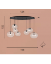 Sospensione a 8 luci realizzata con struttura in metallo nero e sfere in vetro soffiato.