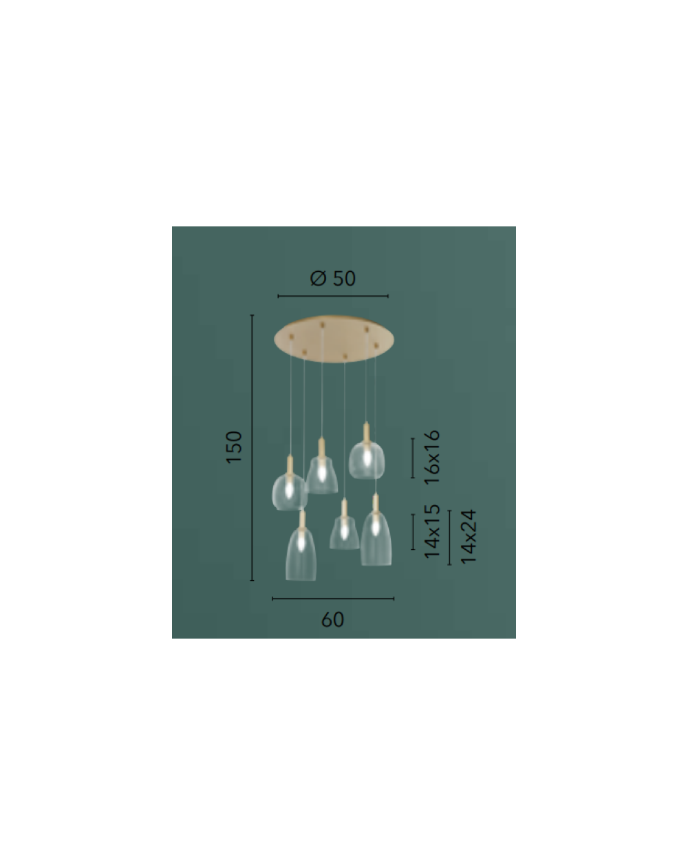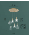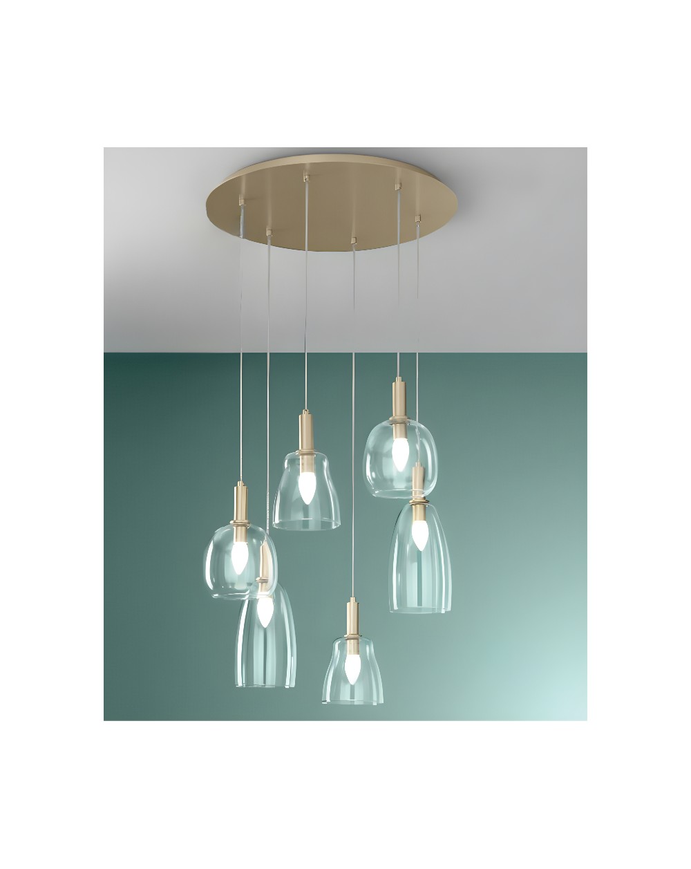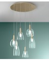 Sospensione realizzata con diffusori finemente lavorati in vetro soffiato dalle configurazioni diverse e finiture in oro satinato.