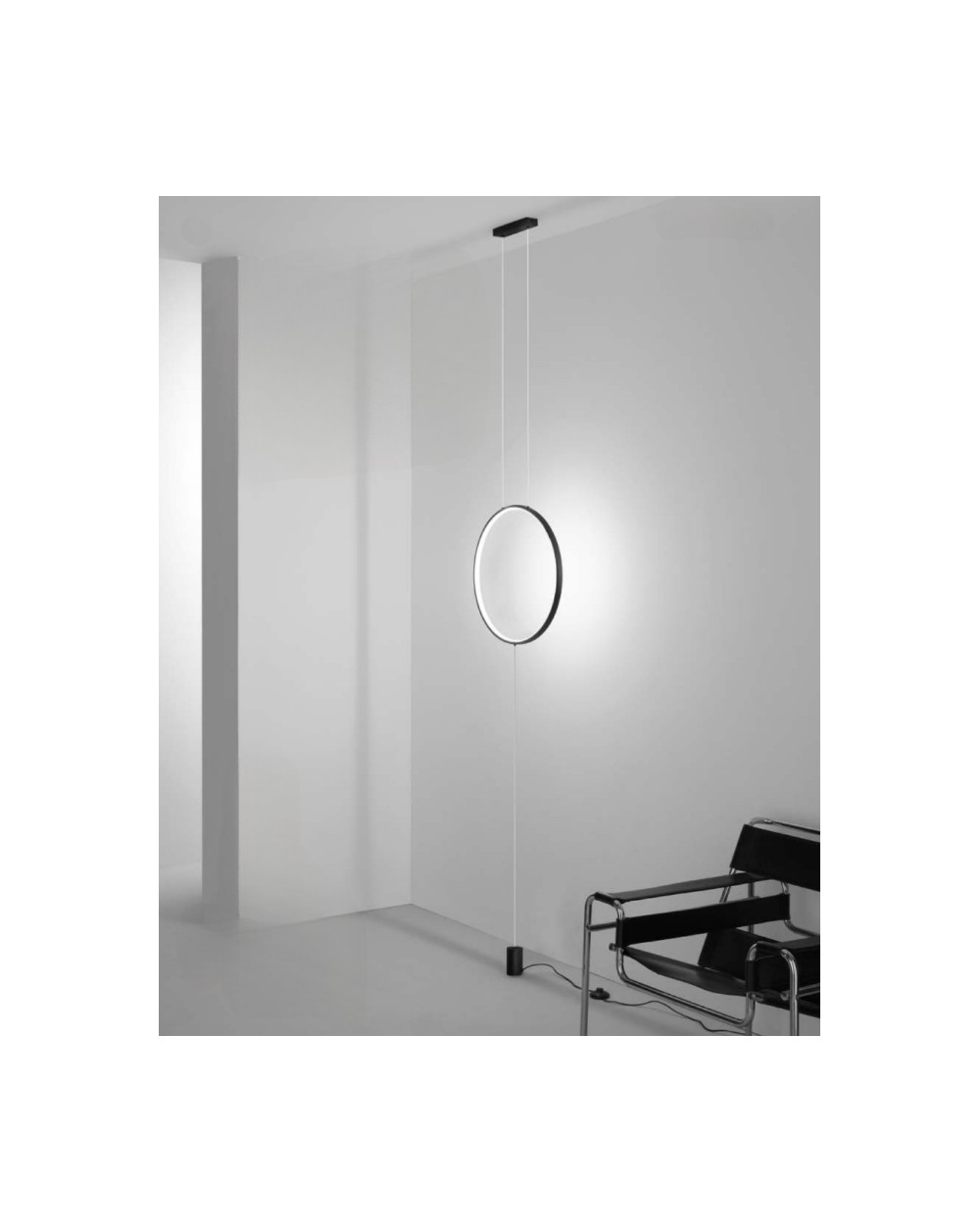 Piantana a sospensione in metallo nelle versioni bianca e nera. Pedaliera per accensione e switch per sistema cambio colore temperatura.
