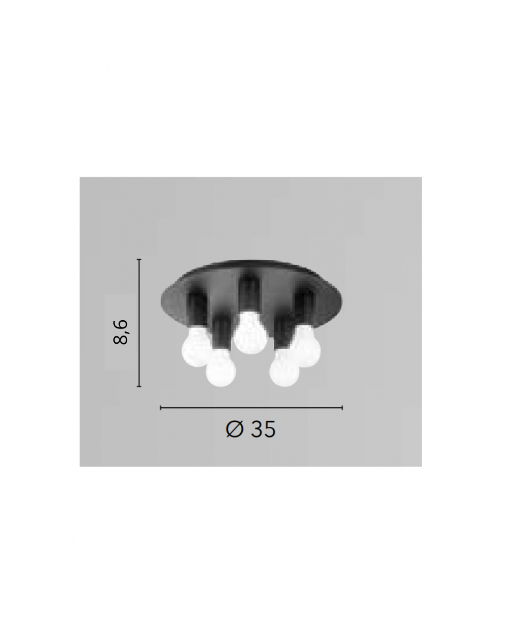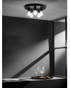Plafoniera a 5 luci in metallo con spot decorativi. Disponibile nei colori nero, bianco opaco e oro satinato.