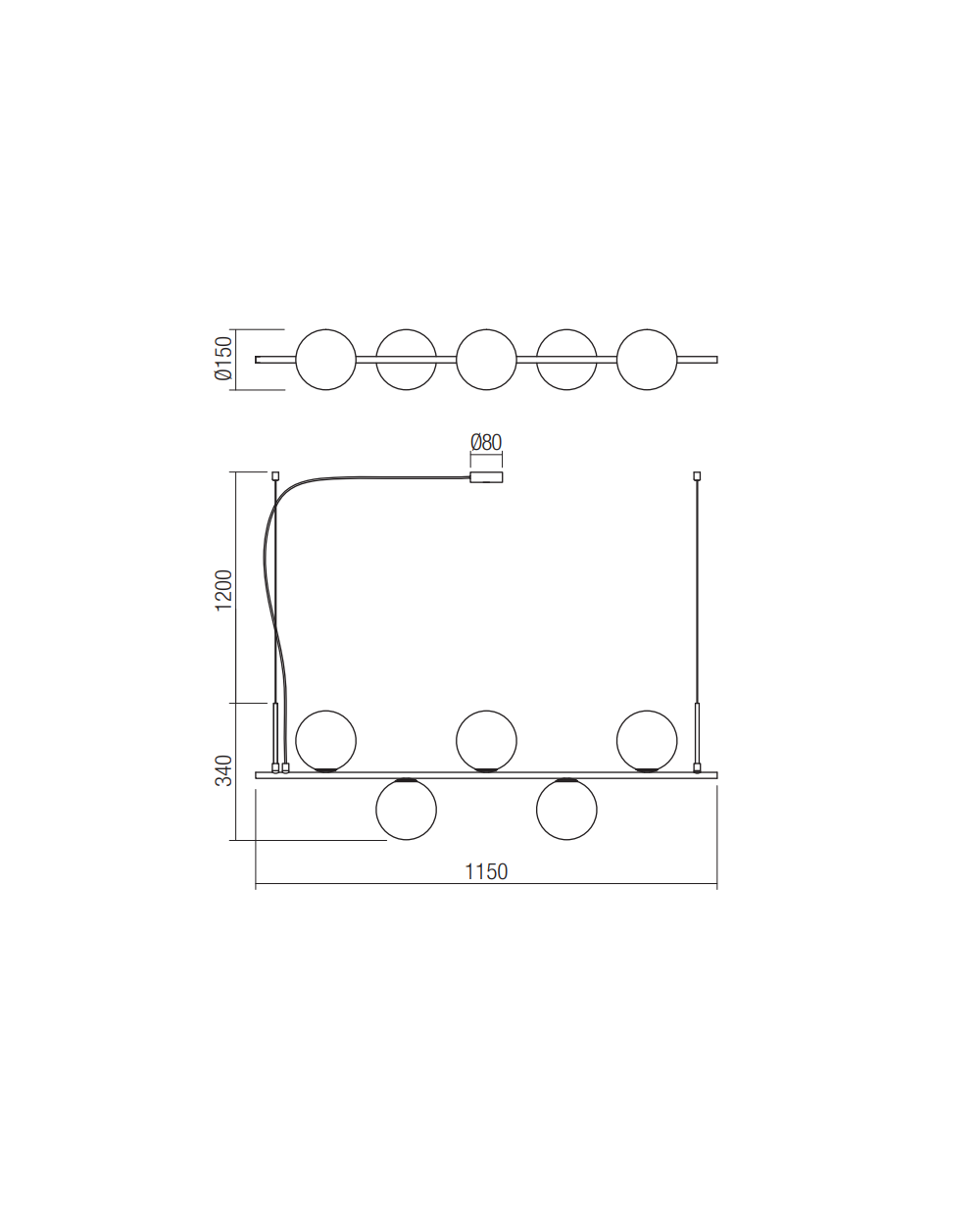 Sospensione cinque luci con struttura in metallo, finitura oro spazzolato o nera, diffusori in vetro soffiato bianco opale. Fornita con cavo tessile bianco o nero.