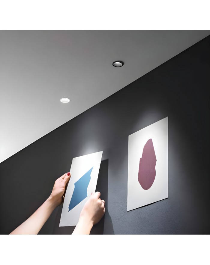 Faretto da incasso con struttura quadrata in termoplastica ultrasottile con interruttore per regolazione temperatura colore.