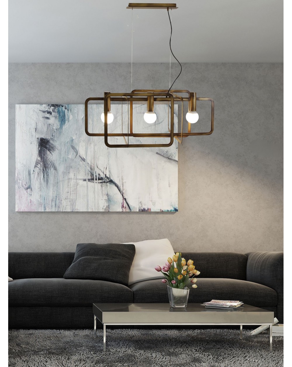 Sospensione 3 luci base dritta con struttura in acciaio verniciato, in diverse forme. Colori a scelta dalla calda tonalità del bronzo al Bianco e Nero