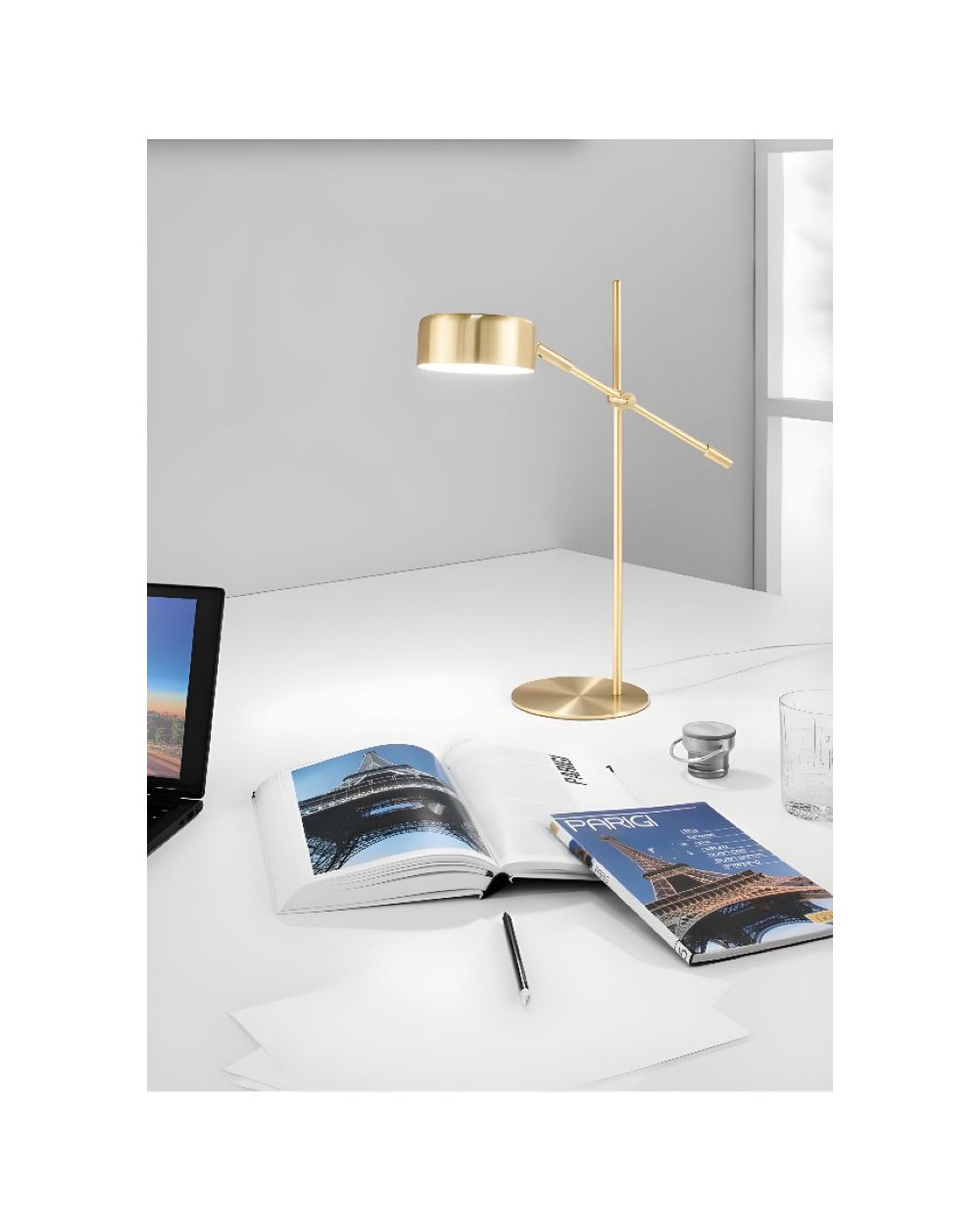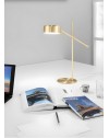Lampada da tavolo realizzata in metallo disponibile nelle versioni bianca, oro, nero e nickel. Punto luce orientabile